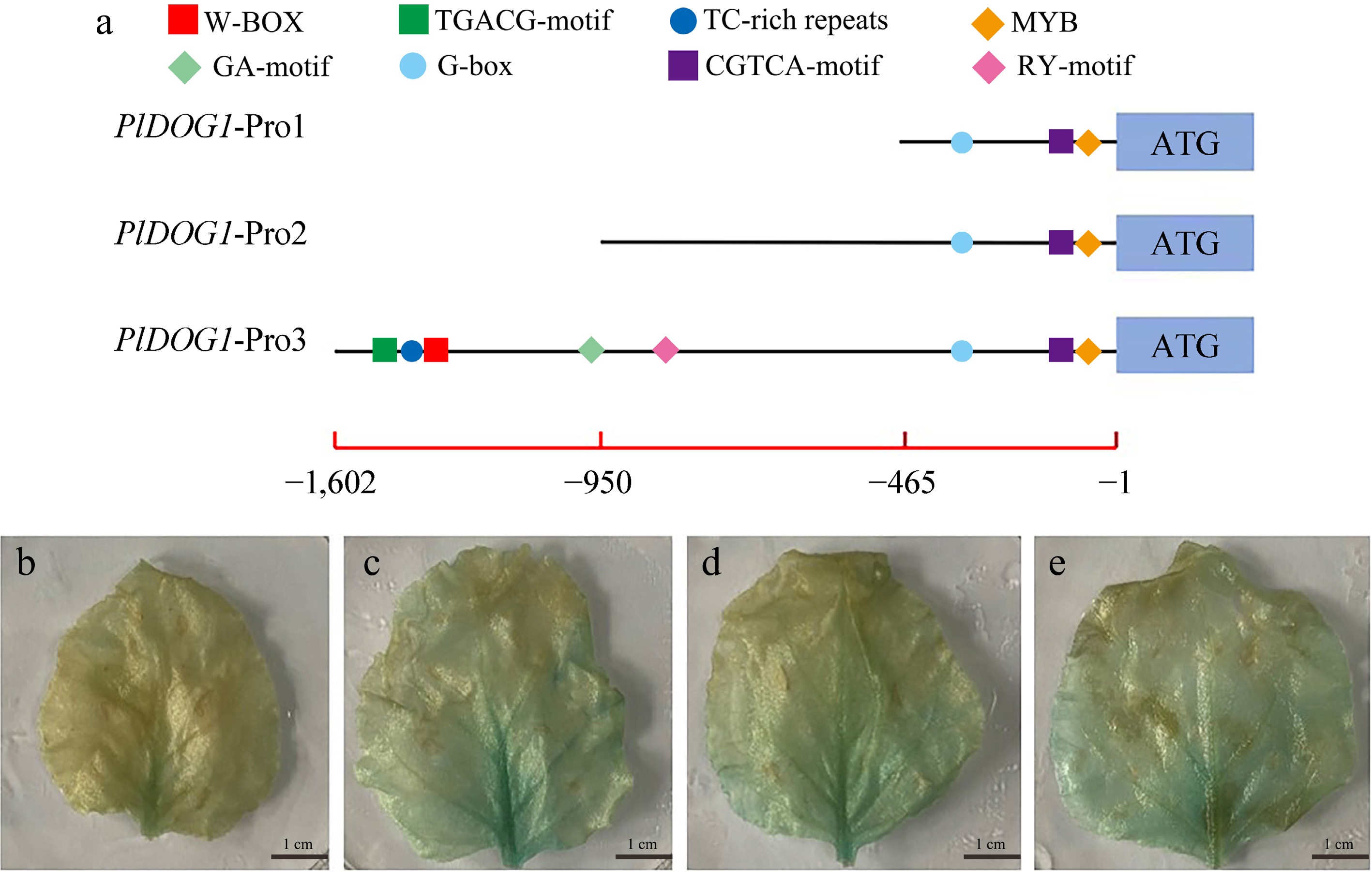 Analysis of promoter activity of PlDOG1 promoter. (a) Schematic diagram of the absence of the 5' end of the PlDOG1 promoter sequence. GUS gene expression driven by different promoter sequences in healthy tobacco leaves: (b) 35S promoter, (c) PlDOG1-Pro1, (d) PlDOG1-Pro2, (e) PlDOG1-Pro3. Bars: 1 cm.