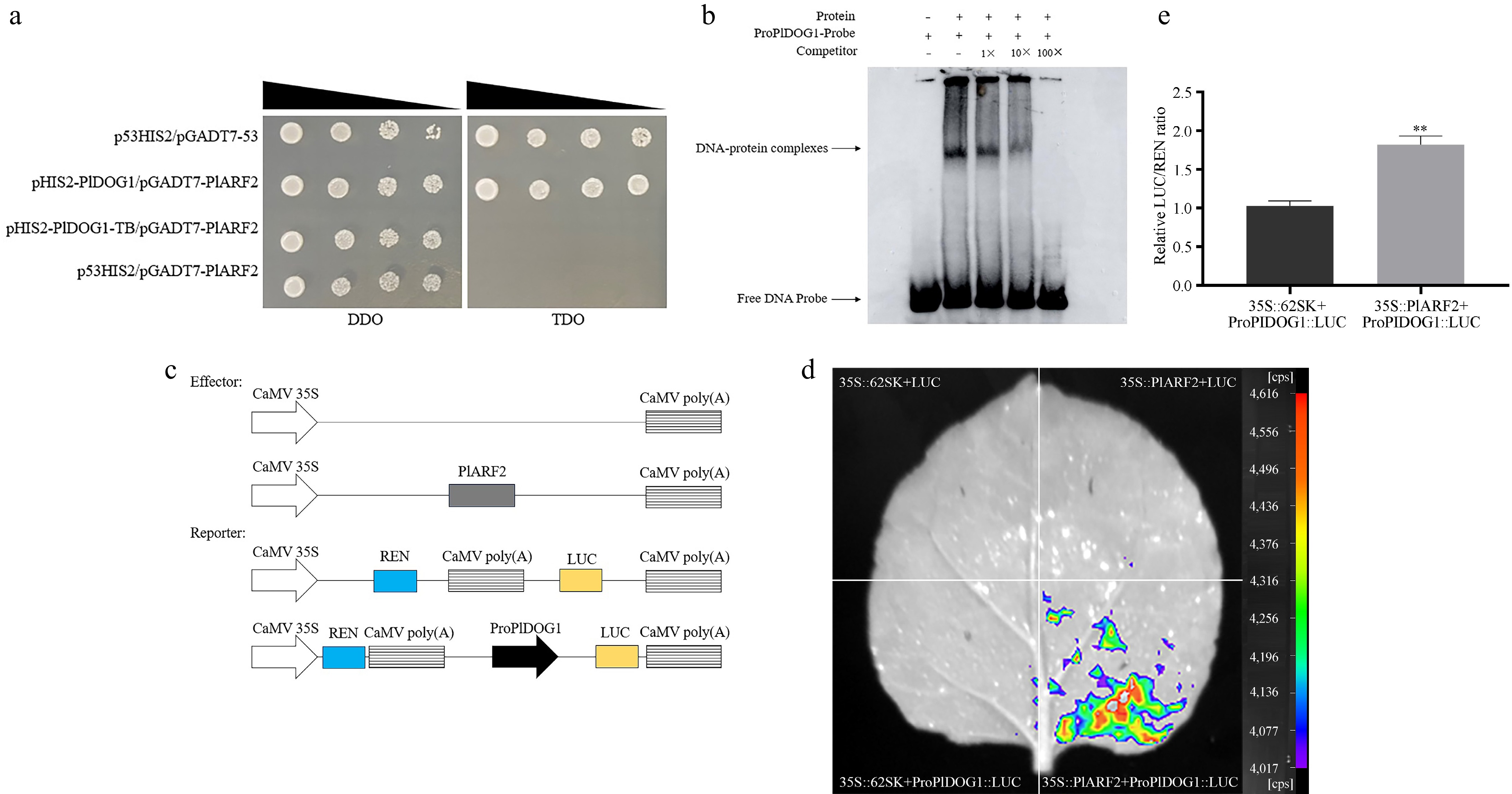Identification of the binding between PlARF2 and the PlDOG1 promoter. (a) The association of PlARF2 with the PlDOG1 promoter determination by using the Y1H system. p53HIS2/pGADT7-53 was the positive control group, pHIS2-PlDOG1/pGADT7-PlARF2 was the experimental group, pHIS2-PlDOG1-TB /pGADT7-PlARF2 was the mutant group, and p53HIS2/pGADT7-PlARF2 was the negative control group. Yeast transformants were serially diluted (1/1, 1/10, 1/100, 1/1000) and plated on TDO selective medium lacking Leucine, Tryptophan, and Histidine, supplemented with 50 mM 3-AT for identification. Parallel cultures grown on DDO medium without Tryptophan and Leucine served as growth controls. (b) EMSA analysis of PlARF2 combined with the promoter of PlDOG1. (c) Diagrammatic representation of Effector and Reporter assembly. (d) LUC fluorescence was detected using a live plant imaging system. (e) Analysis of the relative LUC/REN value. Asterisks in each column denote significant differences (p < 0.01).