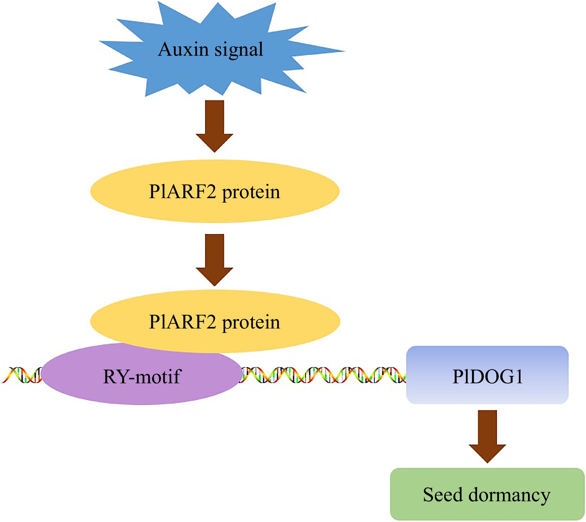 A proposed model illustrates that PlDOG1 regulates seed dormancy through binding to PlARF2. Auxin signals trigger the expression of PlARF2, and then the PlARF2 protein binds to the PlDOG1 promoter to regulate seed dormancy.
