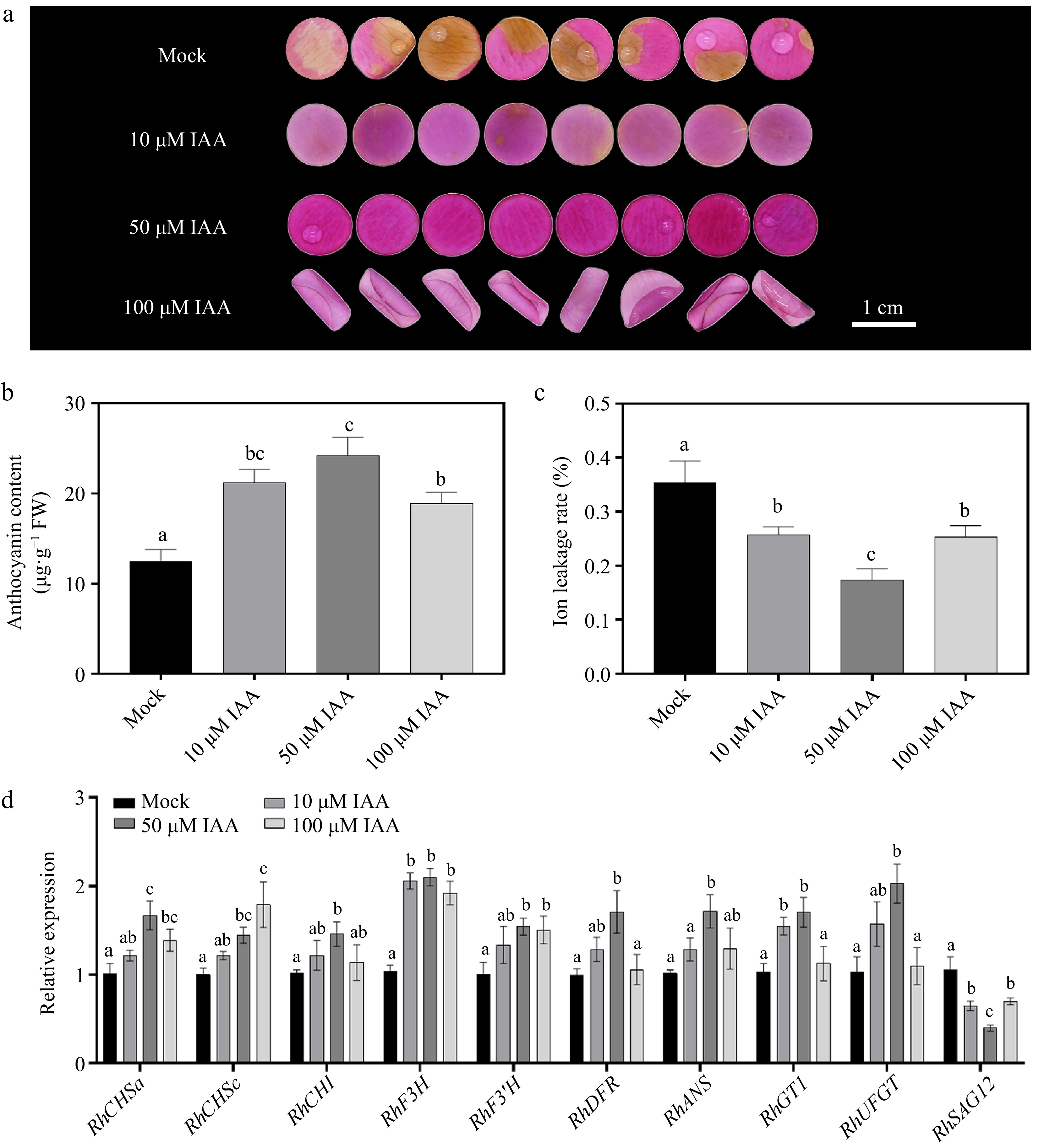 Effects of different concentrations of indole-3-acetic acid (IAA) on petal phenotype, anthocyanin accumulation, ion leakage rate, and gene expression 12 d after treatment. (a) Phenotypic changes of petals treated with 0 μM (Mock control), 10 μM, 50 μM, and 100 μM IAA. After 12 d of treatment, petal color fading was significantly delayed with increasing IAA concentration, with 50 μM and 100 μM treatments exhibiting darker pigmentation. (b) Comparison of anthocyanin content under different IAA concentrations. (c) Changes in ion leakage rate under different IAA treatments. (d) Relative expression levels of the anthocyanin b iosynthesis-related genes (RhCHSa, RhCHSc, RhCHI, RhDFR, RhF3H, RhF3'H, RhANS, RhGT1, and RhUFGT) and senescence marker gene RhSAG12 under different IAA concentrations. Data are presented as means ± SE. Different letters indicate statistically significant differences (p < 0.05).