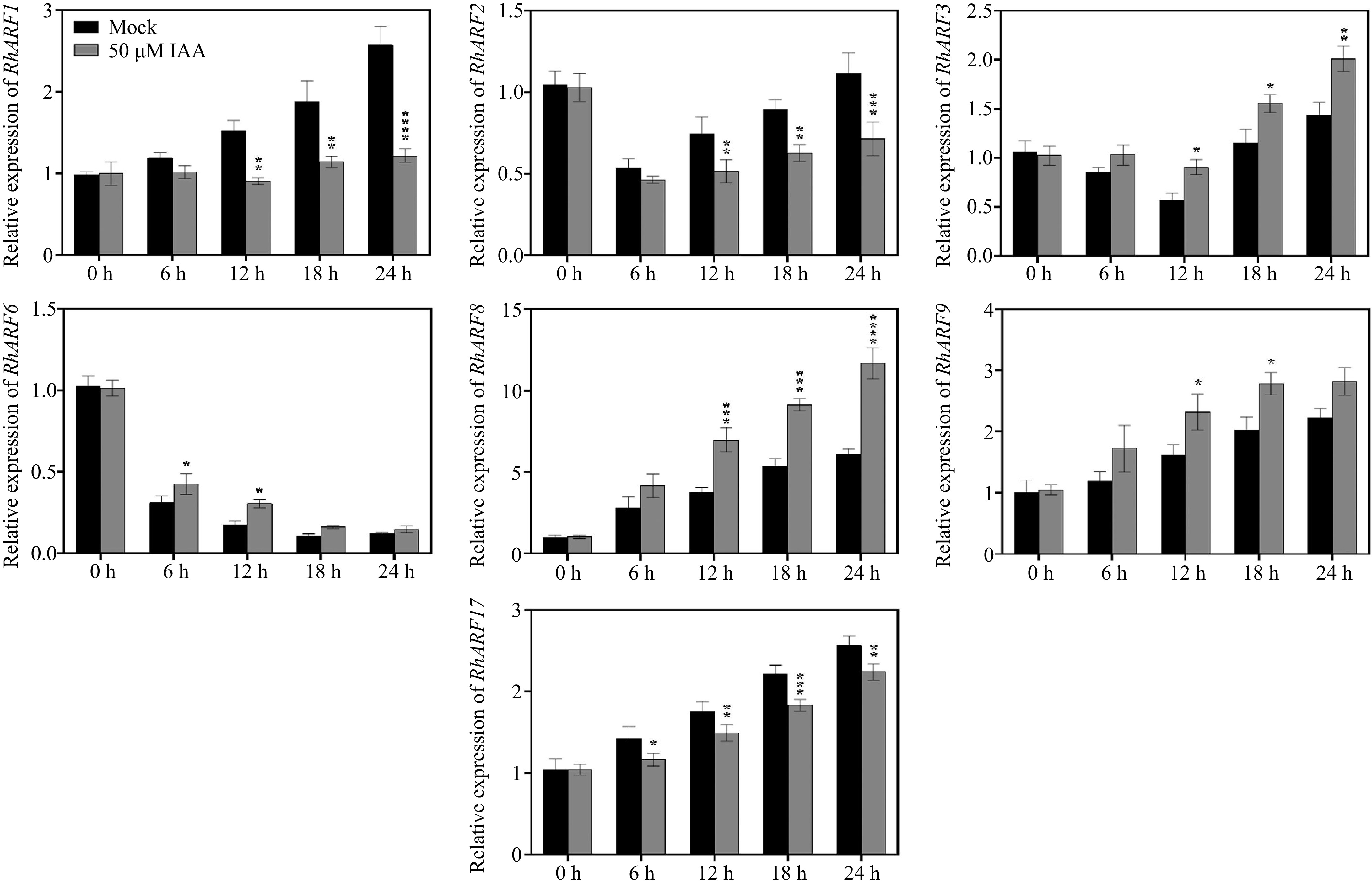 Temporal expression patterns of ARF genes in petals under different IAA treatments. Petals were treated with 50 μM IAA or Mock control, and sampled at 0, 6, 12, 18, and 24 h to determine the relative expression levels of ARF genes. Asterisks indicate significant differences compared to the Mock control (* p < 0.05, ** p < 0.01, *** p < 0.001, **** p < 0.0001). Data are presented as mean ± SE (n = 3).