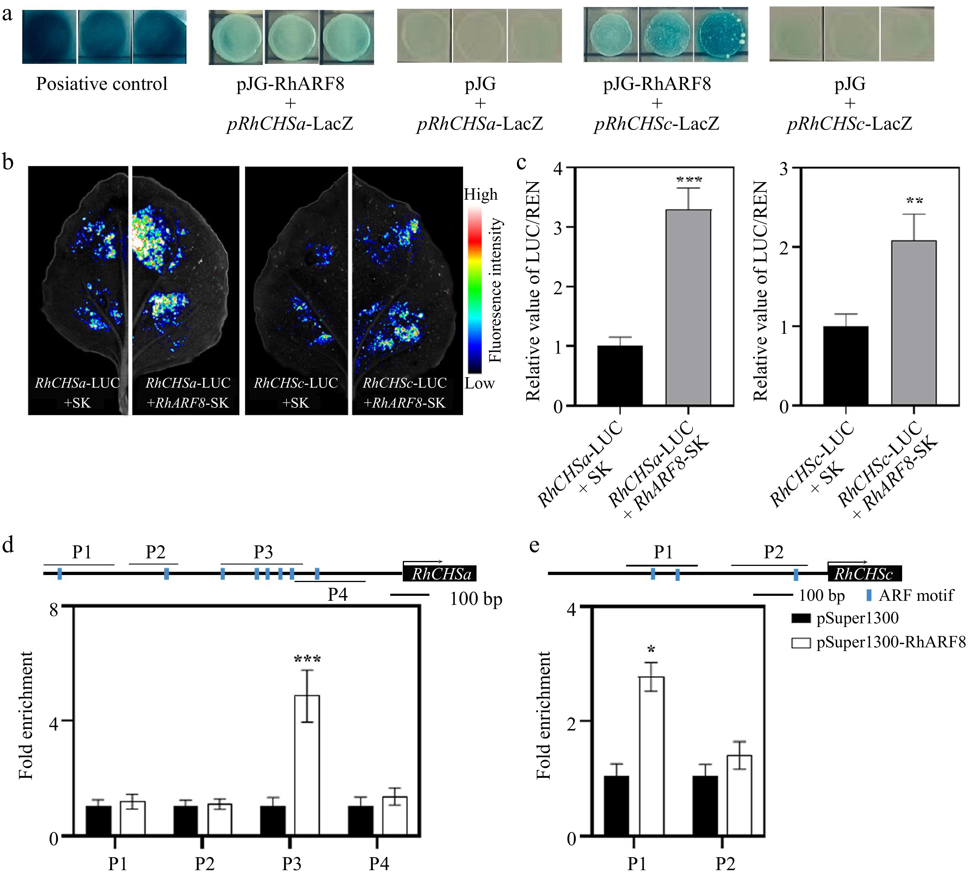 RhARF8 directly binds to the promoters of RhCHSa/c and activates their expression in rose petals. (a) Yeast one-hybrid (Y1H) assay demonstrating the binding of RhARF8 to the promoters of RhCHSa and RhCHSc. Positive controls (pJG + pRhCHSa-LacZ and pJG + pRhCHSc-LacZ) show LacZ activity, while RhARF8 exhibit promoter-binding specificity. (b) Fluorescence imaging showing luciferase activity driven by the RhCHSa and RhCHSc promoters in the presence or absence of RhARF8 in transient assays. The fluorescence intensity was markedly increased in the presence of RhARF8. (c) Quantification of luciferase activity. RhARF8 significantly activated the RhCHSa and RhCHSc promoters compared to the control (*** p < 0.001, ** p < 0.01). (d) Chromatin immunoprecipitation (ChIP)-qPCR analysis showing RhARF8 exhibited significant enrichment at the P3 region of RhCHSa (*** p < 0.001). (e) RhARF8 exhibited significant enrichment at the P1 regions of RhCHSc (* p < 0.05). Values represent means ± SD (n = 3).