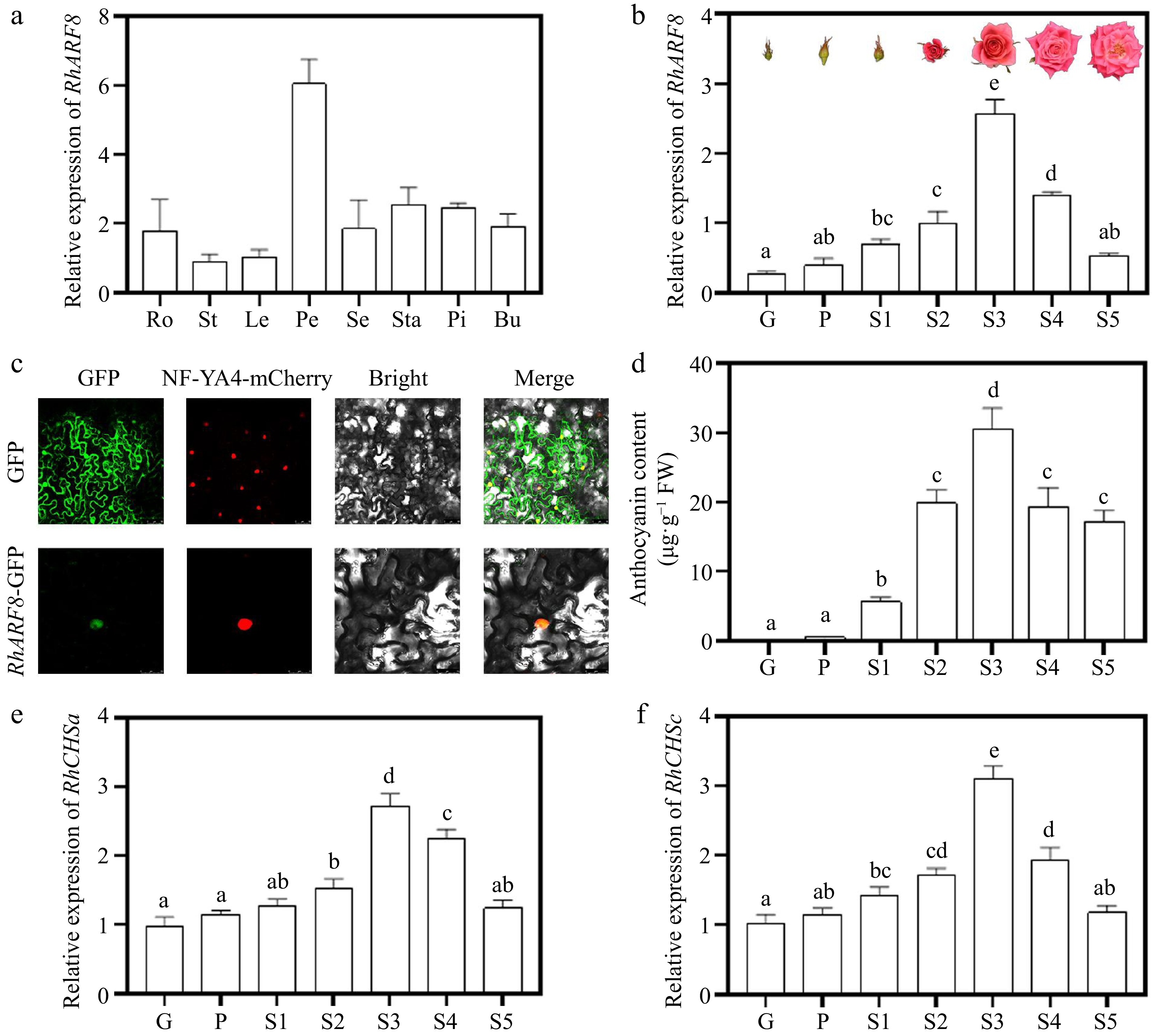 Expression patterns and subcellular localization of RhARF8. (a) Relative expression levels of RhARF8 in different tissues (Ro: root; St: stem; Le: leaf; Pe: petal; Se: sepal; Sta: stamen; Pi: pistil; Bu: bud). (b) Relative expression levels of RhARF8 during flower opening stages (G, P, S1−S5) and phenotypic images of flower opening stages. (c) Subcellular localization of RhARF8 showing nuclear localization. (d) Anthocyanin content during different flower opening stages. (e) Relative expression levels of RhCHSa during flower opening stages. (f) Relative expression levels of RhCHSc during flower opening stages. Data are presented as means ± SE. Different letters indicate significant differences between groups (p < 0.05).