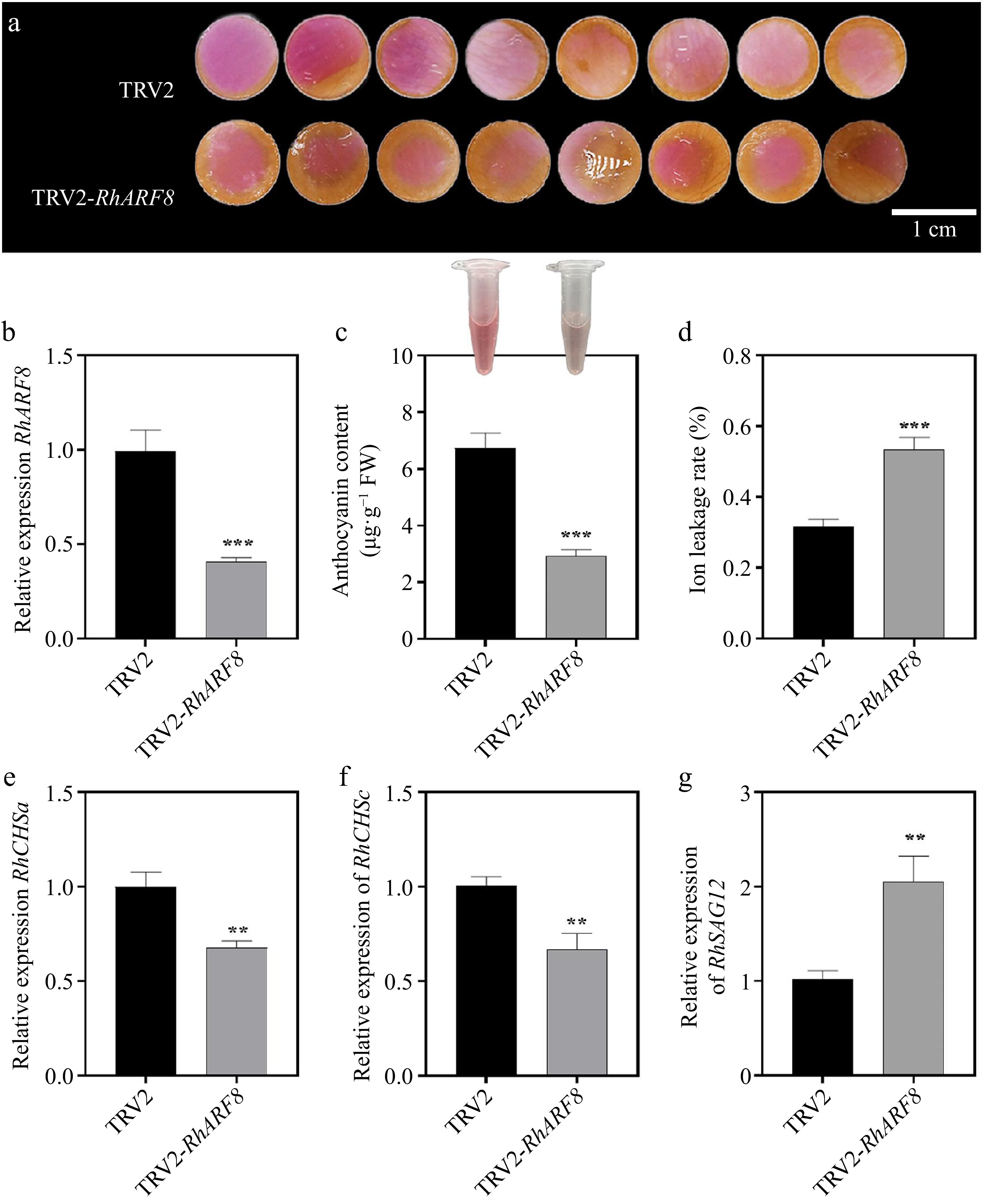Effects of RhARF8 silencing on anthocyanin metabolism and rose petal pigmentation. (a) Petal color changes in TRV2 control and TRV2-RhARF8-treated groups. (b) Relative expression levels of RhARF8. (c) Anthocyanin content. (d) Ion leakage rate. (e) Expression levels of the key anthocyanin biosynthetic gene RhCHSa. (f) Expression levels of the key anthocyanin biosynthetic gene RhCHSc. (g) Expression levels of the senescence marker gene RhSAG12 ( *** p < 0.001, ** p < 0.01, * p < 0.05). Data are presented as means ± SE.