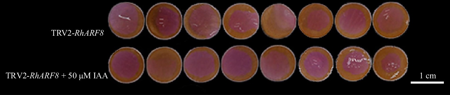 • In summary, our study identifies an auxin signaling factor, RhARF8, that acts as a key regulator of anthocyanin biosynthesis in roses petals via regulating the anthocyanin biosynthesis genes RhCHSa/c. These findings provide a theoretical basis for improving rose petal color traits through breeding or genetic engineering.