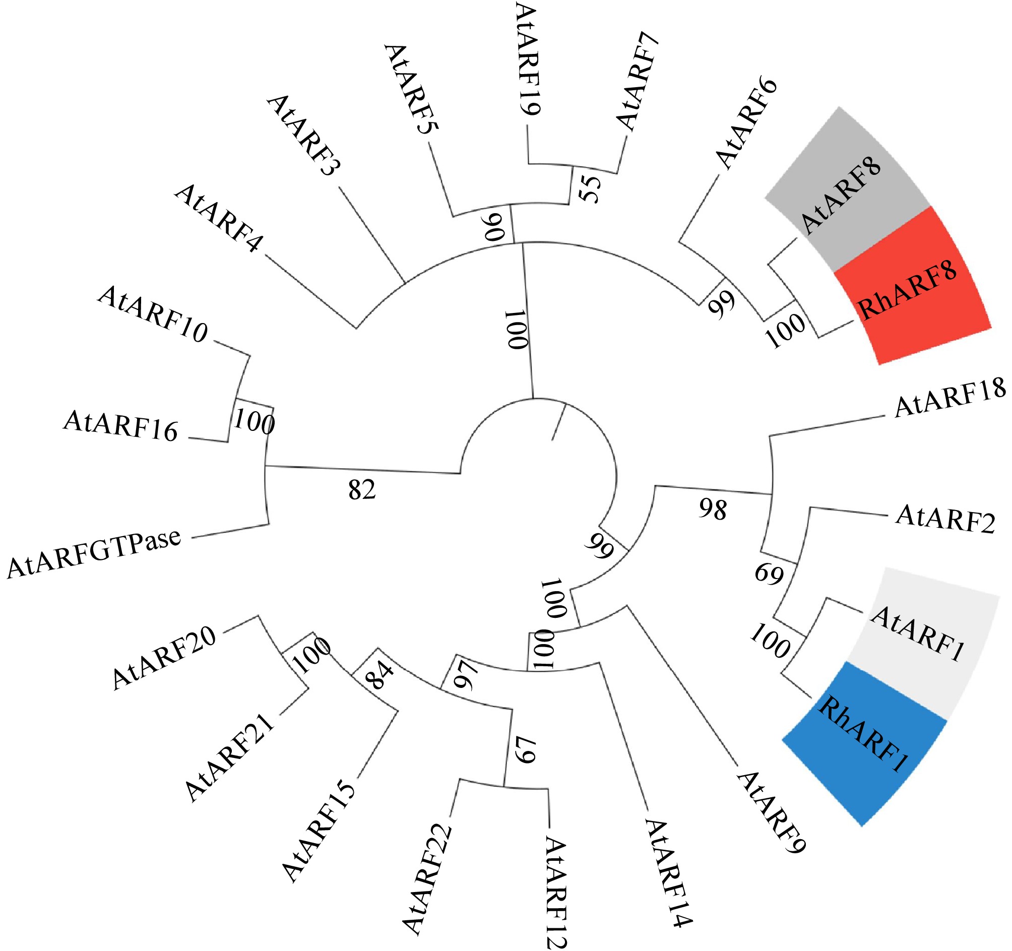 Phylogenetic analysis of RhARF8 and RhARF1. Phylogenetic tree based on full-length amino acid sequences showing that RhARF8 and RhARF1 cluster into distinct clades with AtARF8 and AtARF1 from Arabidopsis thaliana, highlighting their functional specificity and evolutionary divergence.