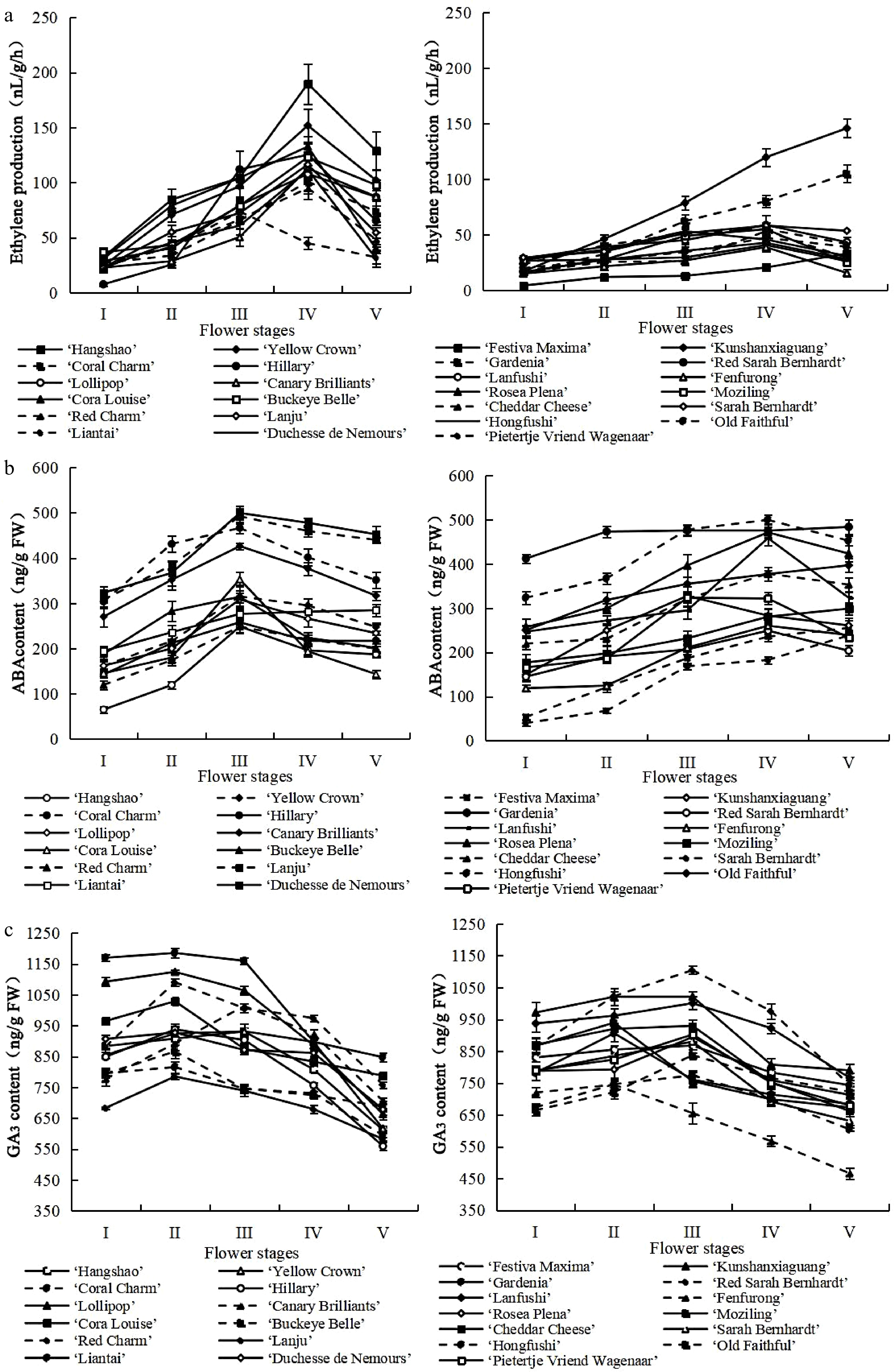 We used 25 cultivars with five different colors of herbaceous peony, including red, pink, white, purple and yellow, as our study subject (Supplementary Fig. S1). Since ethylene, ABA, and GA are important hormones regulating flower senescence, we examined their content changes during the five stages described above.