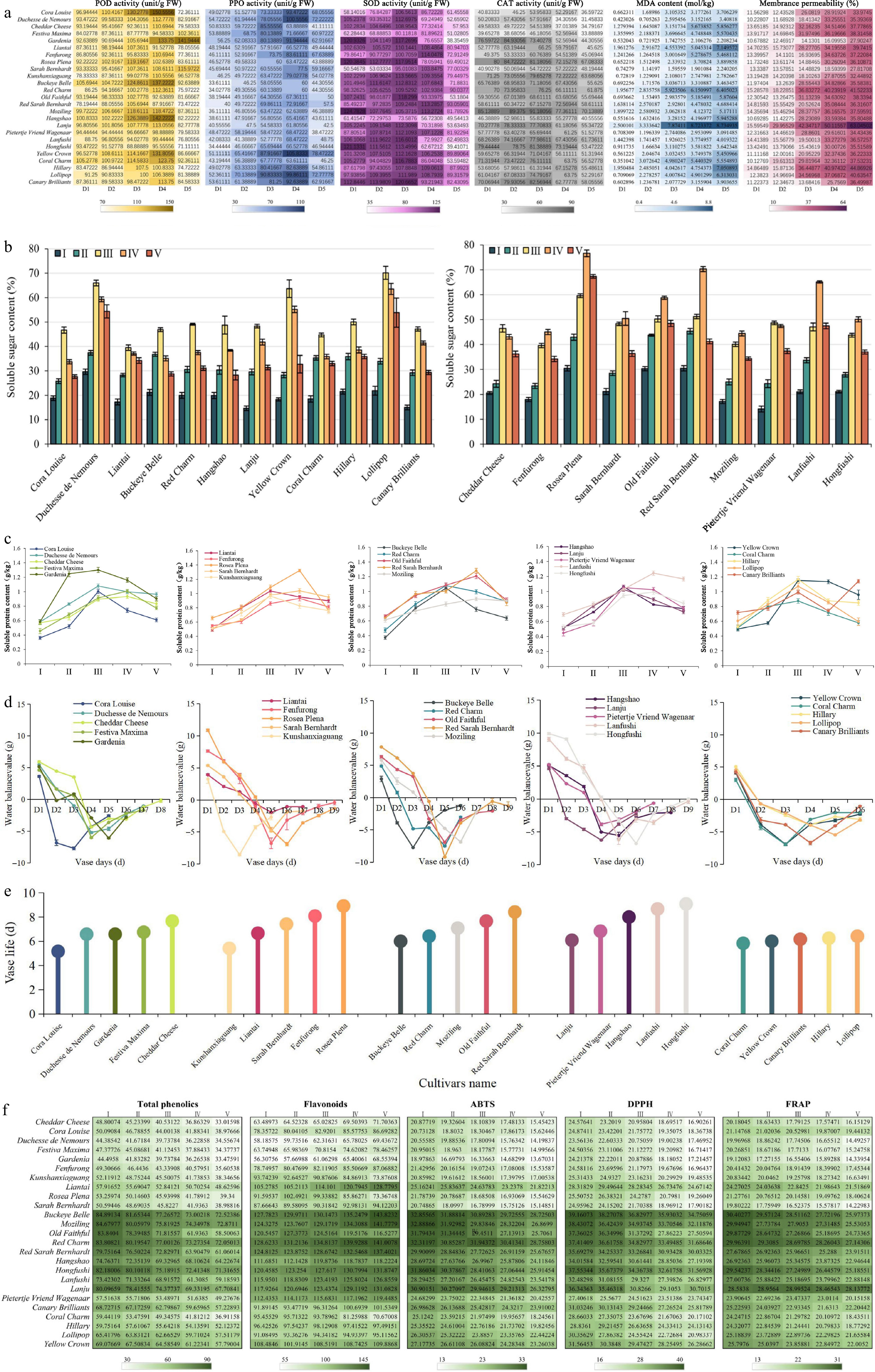Longevity of different cultivars of herbaceous peony flowers and their changes in physiological indicators during herbaceous peony senescence. (a) Changes in POD, PPO, SOD, CAT activity, MDA content, and membrance permeability. (b) Changes in soluble sugar content. (c) Changes in soluble protein content. (d) Changes in water balance. (e) Longevity of different herbaceous peony cultivars. (f) Changes in total phenolic and flavonoid content and activity of three antioxidants. Error bars show the SD of the means of three biological replicates.