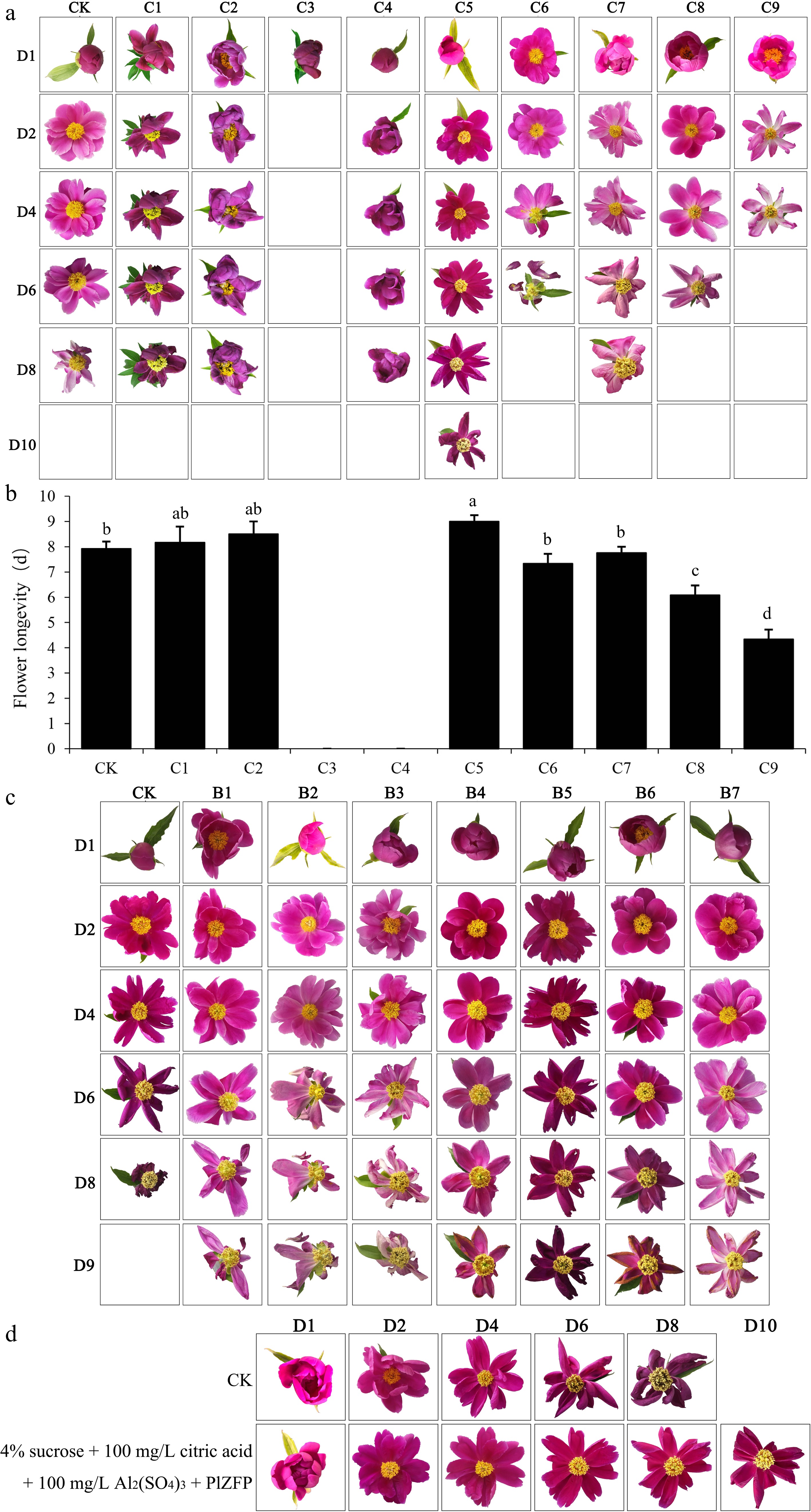 No. Formulas of vase solutions Opening days (d) Blooming days (d) Vase life (d) CK Water 2.17 ± 0.14b 3.42 ± 0.38b 7.92 ± 0.58c B1 4% sucrose + 100 mg/L citric acid 2.08 ± 0.29b 4.08 ± 0.14a 9.33 ± 0.14b B2 4% sucrose + 100 mg/L Al2(SO4)3 2.42 ± 0.29ab 4.17 ± 0.14a 9.50 ± 0.43ab B3 4% sucrose + 200 mg/L 8-HQS 2.33 ± 0.14ab 4.00 ± 0.25ab 9.25 ± 0.25b B4 4% sucrose + 100 mg/L citric acid + 100 mg/L Al2(SO4)3 2.58 ± 0.29a 4.17 ± 0.14a 9.75 ± 0.25a B5 4% sucrose + 100 mg/L citric acid + 200 mg/L 8-HQS 2.42 ± 0.14ab 4.08 ± 0.38a 9.33 ± 0.38ab B6 4% sucrose + 100 mg/L Al2(SO4)3 + 200 mg/L 8-HQS 2.50 ± 0.25ab 4.00 ± 0.25ab 9.58 ± 0.14ab B7 4% sucrose + 100 mg/L citric acid + 100 mg/L Al2(SO4)3 + 200 mg/L 8-HQS 2.50 ± 0.25a 4.08 ± 0.14a 9.67 ± 0.38ab Different letters indicate significant differences using one-way ANOVA test at p < 0.05. Since both VIGS technology and vase solutions can effectively prolong the longevity of flowers, we combined them to develop a new postharvest preservation approach to extend flower longevity. The effect of vase solutions and VIGS treatment on extending flower longevity is shown in Fig. 3d. This new approach can extend the longevity of herbaceous peony flowers by 30% (Table 3).