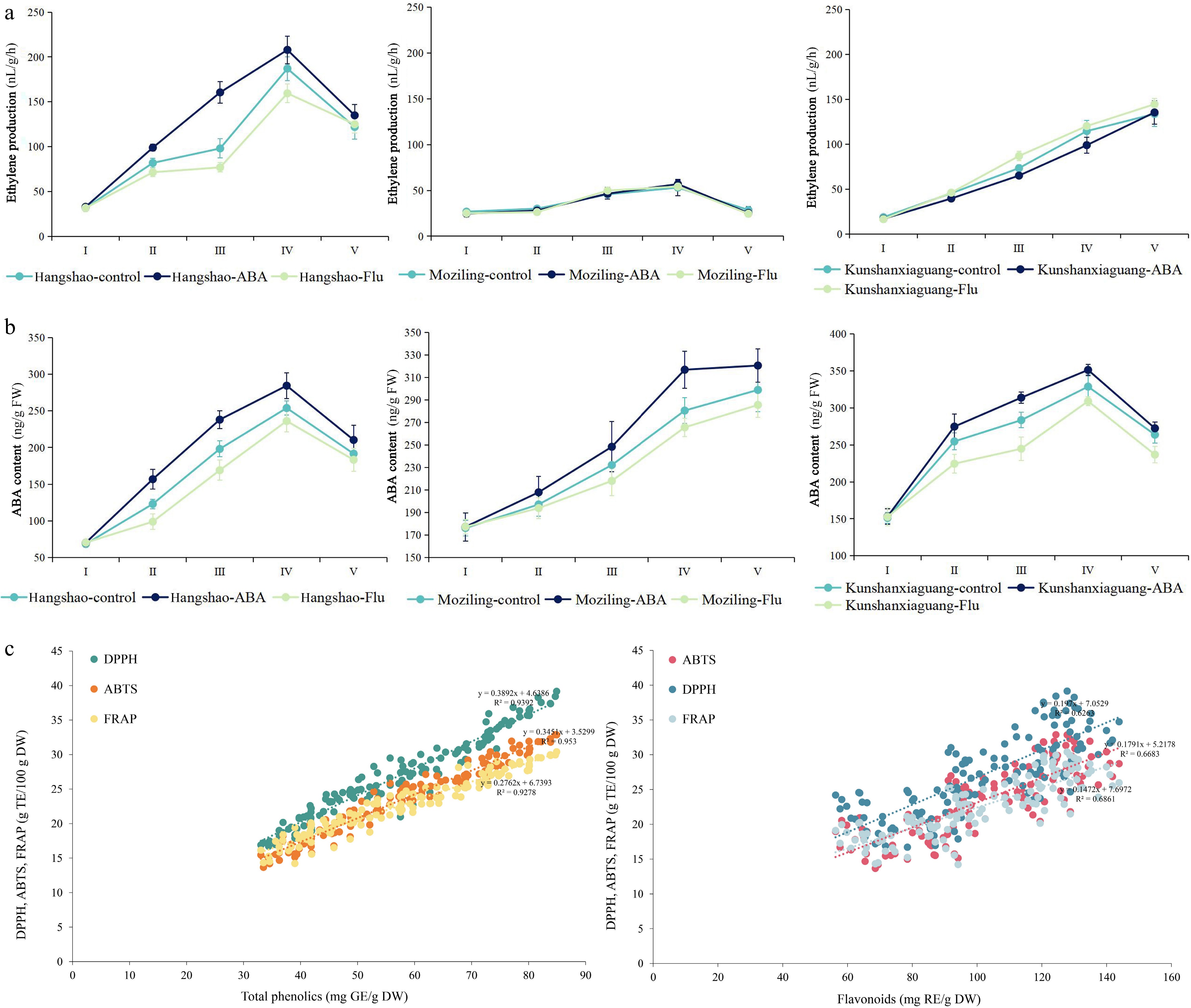 Ethylene production and ABA content in 'Hangshao', 'Moziling', and 'Kunshanxiaguang' after ABA and Flu treatment, and scatter diagram of the antioxidant activity with total phenolics/flavonoids. (a) Changes in ethylene production during 'Hangshao', 'Moziling', and 'Kunshanxiaguang' senescence after ABA and Flu treatment. (b) Changes in ABA content during 'Hangshao', 'Moziling', and 'Kunshanxiaguang' senescence after ABA and Flu treatment. (c) Scatter diagram of the antioxidant activity with total phenolics and total flavonoids.
