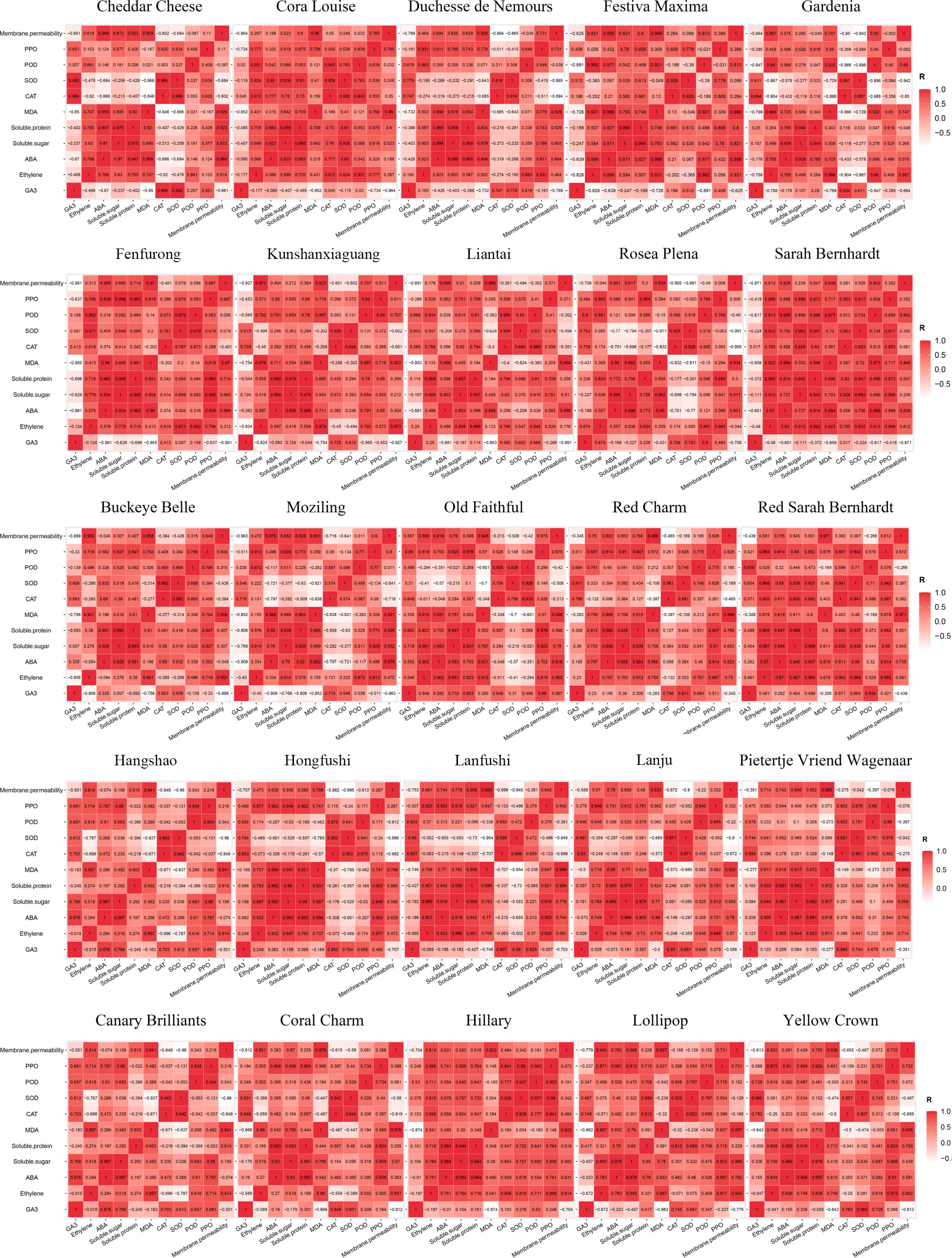 A significant difference could be observed in ethylene production between the different cultivars. According to the ethylene production trend, the 25 cultivars could be classified into three types: the climacteric type, the non climacteric type, and the type with a later stage increase. As shown in Fig. 1a, the climacteric type, whose ethylene production increased gradually during opening, peaked at the full open phase, and then decreased, included 'Hangshao', 'Yellow Crown', 'Coral Charm', 'Hillary', 'Lollipop', 'Canary Brilliants', 'Cora Louise', 'Buckeye Belle', 'Red Charm', 'Lanju', 'Liantai', and 'Duchesse de Nemours'. The non climacteric type, whose ethylene production either decreased or remained at a relatively stable level from opening to senescence, included 'Red Sarah Bernhard', 'Lanfushi', 'Fenfurong', 'Rosea Plena', 'Moziling', 'Cheddar Cheese', 'Sarah Bernhardt', 'Hongfushi', 'Old Faithful', and 'Pietertje Vriend Wagenaar'. The type with the later stage increase, whose ethylene production increased during opening and peaked at senescence, included 'Festiva Maxima', 'Kunshanxiaguang', and 'Gardenia'. The ABA content of these herbaceous peony cultivars exhibited a tendency to increase first and then decrease but still maintained a high level at stage V compared with early stages, except for 'Festiva Maxima', 'Liantai', 'Rosea Plena', 'Moziling', and 'Old Faithful', which showed a continuous increase in ABA content (Fig. 1b). The content of GA3 was high in the early stages and then declined rapidly until stage V, where it reached its lowest level (Fig. 1c). To further understand the role of GA in herbaceous peony flower senescence, we also measured the content of GA1, GA4, and GA7. The content of GA1 and GA4 were high in stages I and II, then declined rapidly until stage V (Supplementary Fig. S2a, b). The content of GA7 remained at a lower level compared to the other three gibberellins, but it also peaked at stage I or stage II (Supplementary Fig. S2c). These results suggested that GA content may negatively correlate with herbaceous peony flower senescence and that ABA content and ethylene production may positively correlate with herbaceous peony flower senescence.