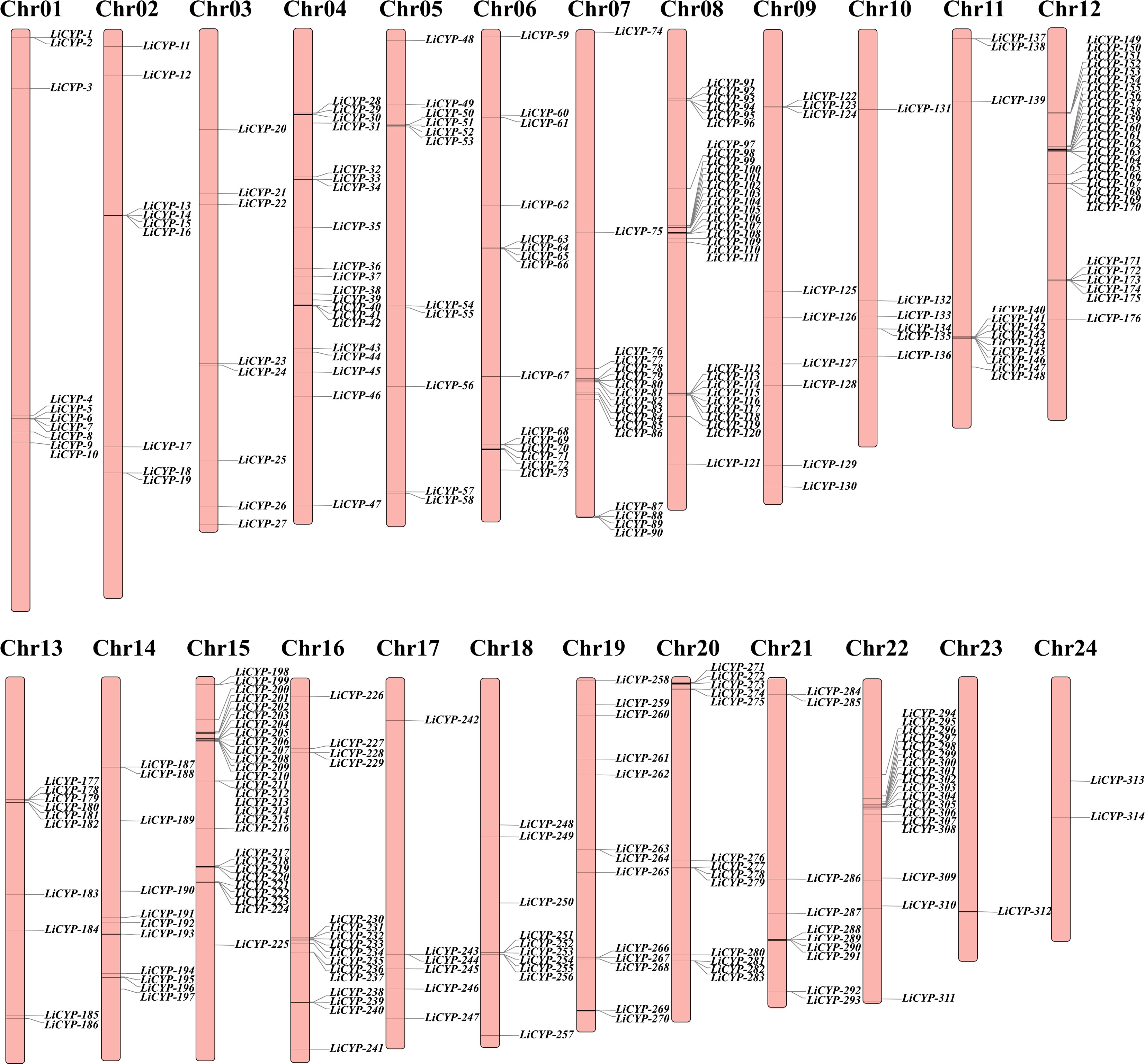 • In the present investigation, a comprehensive total of 314 LiCYP450 members were determined by employing BLAST and HMMER search approaches, with subsequent validation of their structural domains. The chromosomal localization analysis revealed the 314 CYP450 genes were distributed unevenly yet widely over 23 chromosomes (as depicted in Fig. 1). It is noteworthy that chromosome 8 contained the largest quantity of genes, totaling 31, whereas chromosome 23 had the lowest, with only one gene. These genes were named LiCYP-1 to LiCYP-314 on the basis of their chromosomal placement.