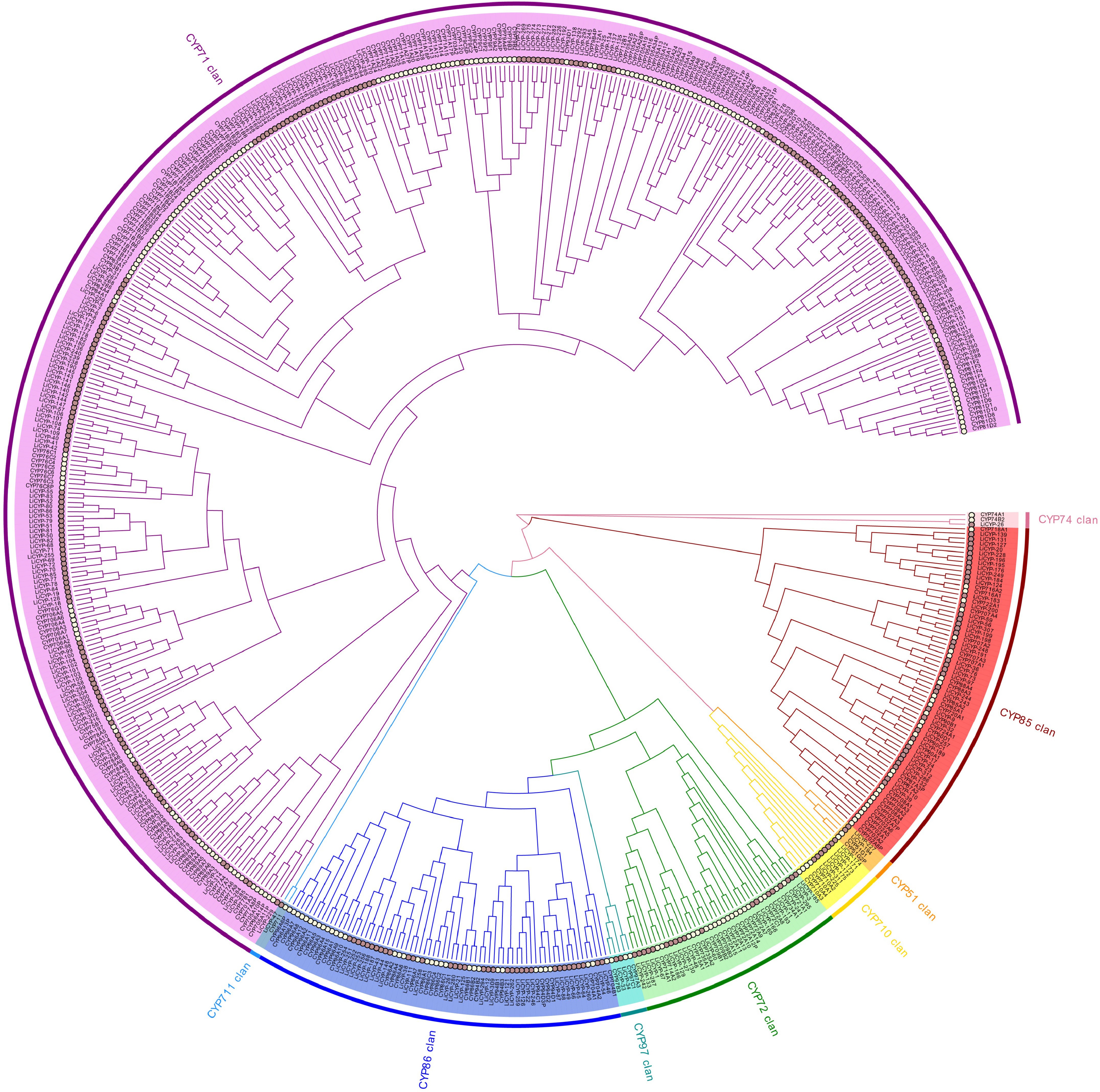 Based on evolutionary links and amino acid sequence similarity, CYP450 can be divided into two groups within this superfamily: monogenic and polygenic families. The P450s identified so far in plants can be classified into 11 family clusters, of which there are seven monogenic clusters (CYP51/746/74/711/97/710/727) and four multifamily clusters (CYP71/86/85/72)[10]. With the development of sequencing technology, many plants such as Arabidopsis thaliana, Oryza sativa, Solanum lycopersicum, Vitis vinifera, Brassica rapa, Cajanus cajan, and many other plants have undergone a series of genome-wide characterizations and analyses to determine their family affiliation and evolution[1116]. For most plants, the CYP450 gene family encompasses a member count ranging from 100 to 300. However, the precise number of CYP450 gene family members exhibits significant variation across different plant species[17].