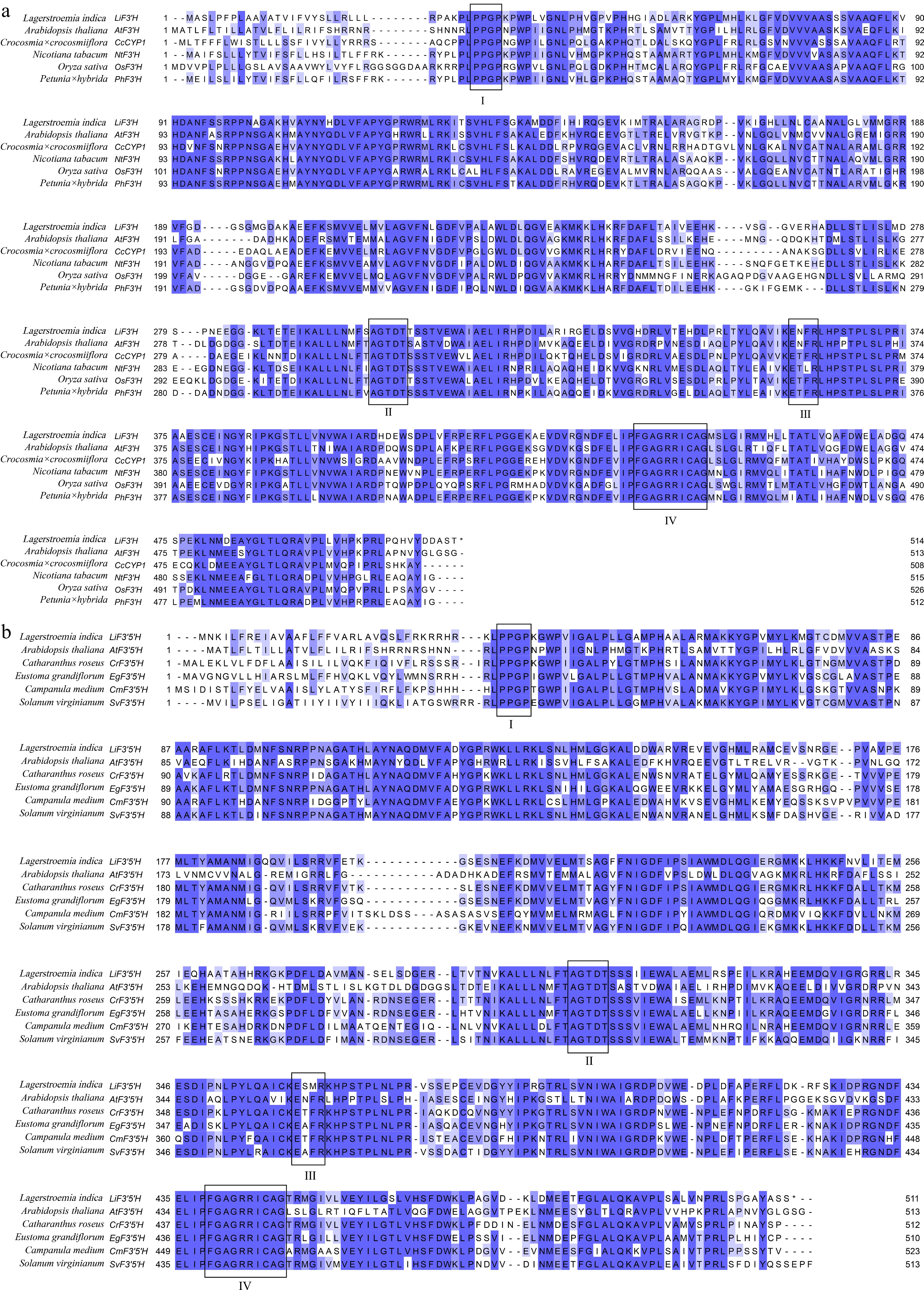 (a) Multiple sequence alignment of F3'Hs from various plant species. (b) Multiple sequence alignment of F3'5Hs from various plant species. Boxed in red are the motifs characteristic of P450, encompassing the hinge region (I), the oxygen-binding pocket (II), the E - X - X - R motif (III), and the heme-binding domain (IV). F3'Hs and F3'5'Hs proteins originating from different species include AtF3'H (Arabidopsis thaliana), CcCYP1 (Crocosmia × crocosmiiflora), NtF3'H (Nicotiana tabacum), OsF3'H (Oryza sativa), PhF3'H (Petunia × hybrida), AtF3'5'H (Arabidopsis thaliana), CrF3'5'H (Catharanthus roseus), EgF3'5'H (Eustoma grandiflorum), CmF3'5'H (Campanula medium), SvF3'5'H (Solanum virginianum).