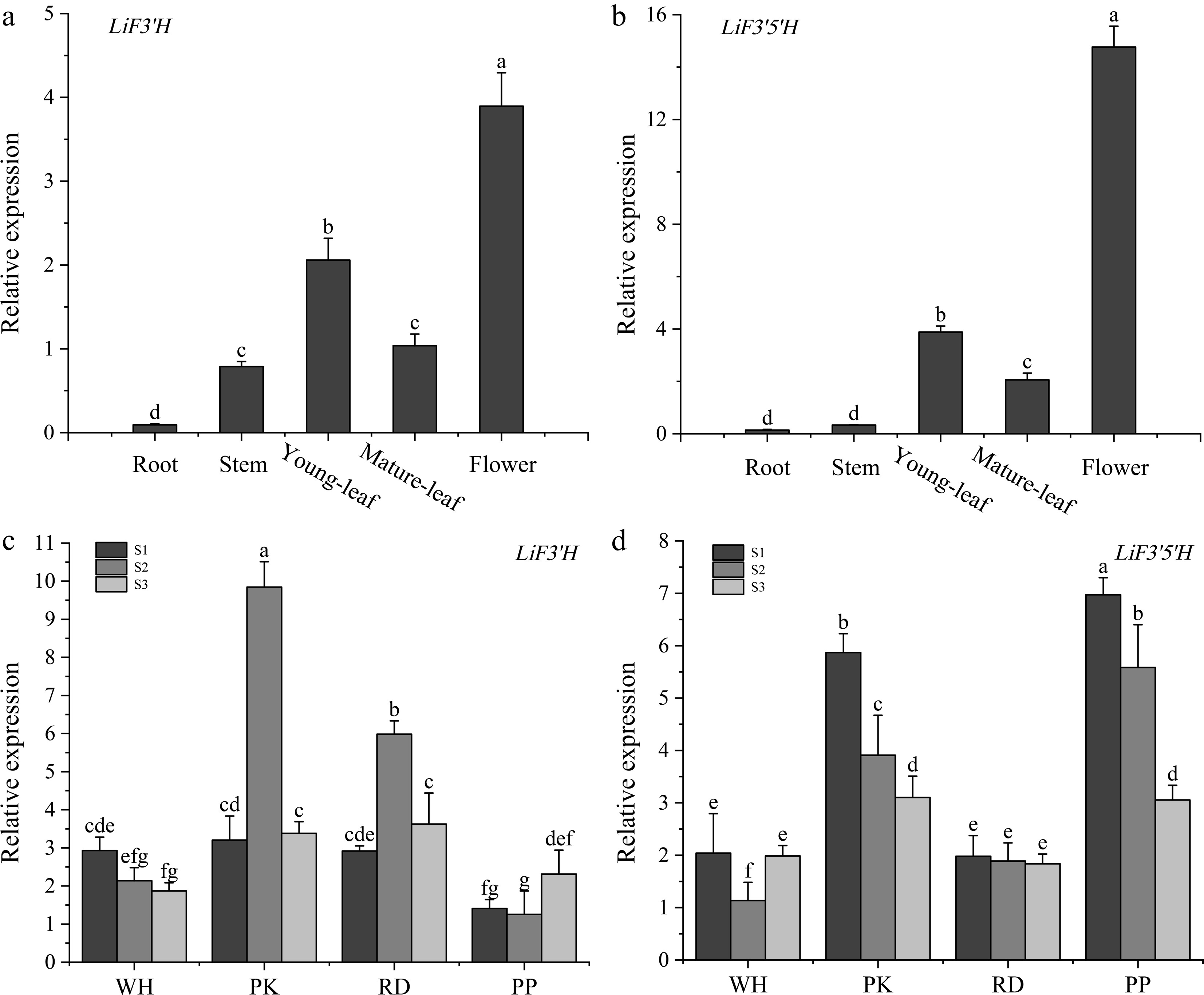 • Gene expression profiles of the genes LiF3'H and LiF3'5'H across distinct tissues were evaluated using qRT-PCR. The outcomes demonstrated that both genes exhibited the peak expression in flowers, with new leaves showing the subsequent highest expression, and these expression levels were markedly elevated compared to those in other tissues (as illustrated in Fig. 6a & b). Expression analysis of the genes LiF3'H and LiF3'5'H in different flower colors at different times was performed by qRT-PCR. The findings showed the expression magnitude of LiF3'H in PK at the S2 stage exhibited a notably higher value in comparison to other cultivars (Fig. 6c). LiF3'5'H showed a decreasing trend in PK, RD, and PP, and the expression reached the highest in PP at the S1 period, and exhibited a considerably higher value in PP and PK than in WH and RD (Fig. 6d).