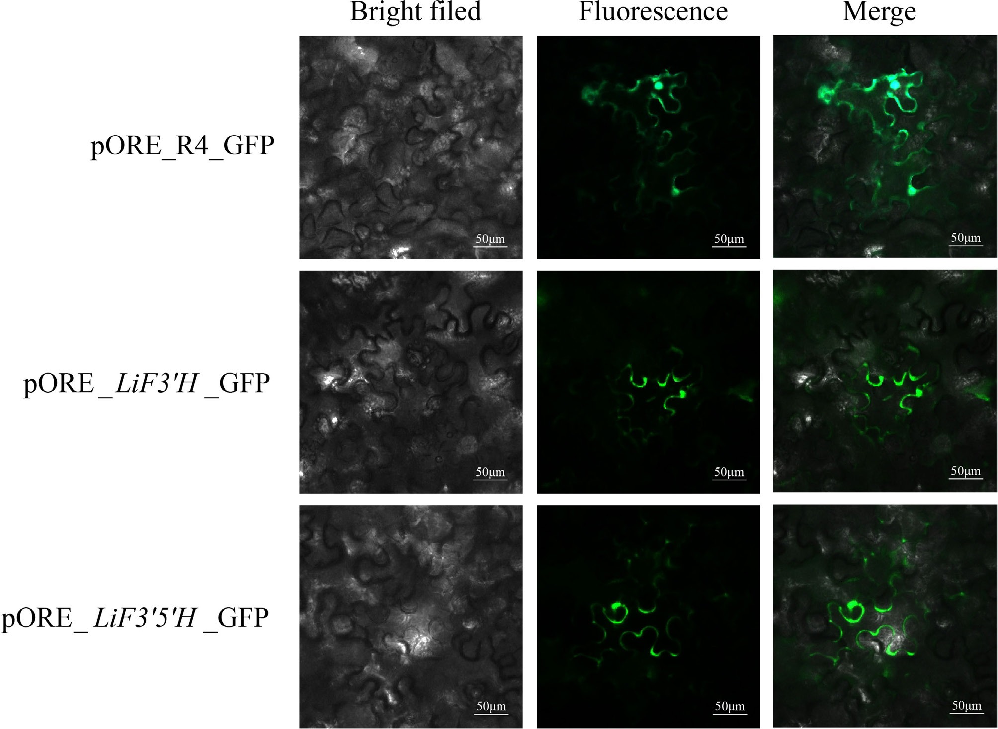 • The CDS sequences of LiF3'H and LiF3'5'H were successfully obtained by using L. indica petal cDNA as a template and designing specific primers for amplification based on the genomic sequence. The genes LiF3'H and LiF3'5'H were constructed into the pORE_R4 vector containing a GFP tag and transformed into Agrobacterium to be injected into the lower epidermal cells of Ben's tobacco. The results showed that pORE_R4 showed green fluorescent signals throughout the cell, involving the nucleus, cell membrane, and cytoplasm, but the genes LiF3'H and LiF3'5'H were found only on the cell membrane (Fig. 7).