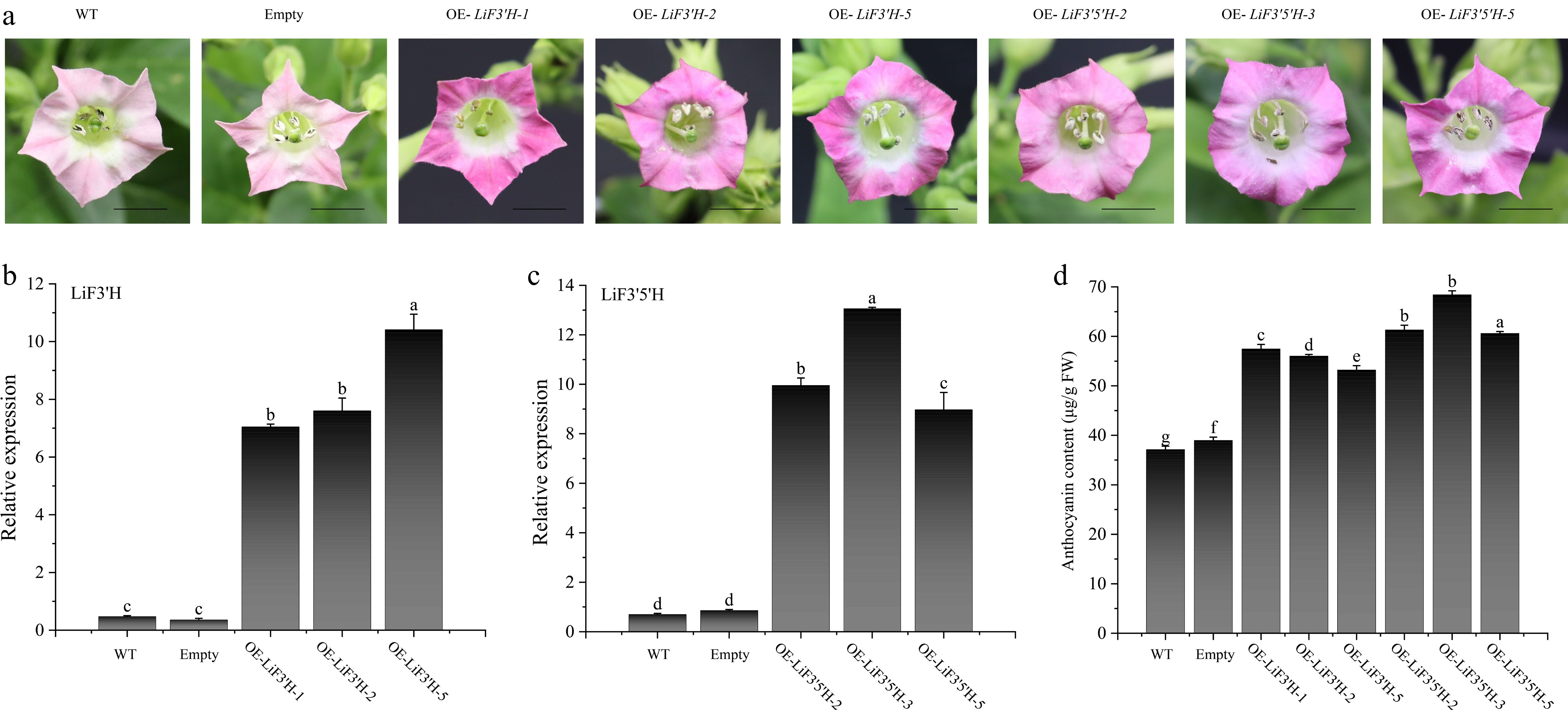 (a) The phenotype of LiF3'H and LiF3'5'H transgenic tobacco. (b) The expression level of LiF3'H in WT, empty, and transgenic lines. (c) The expression level of LiF3'5'H in WT, empty, and transgenic lines. (d) The content of anthocyanin. The black line on the petal diagram showed a scale of 1 cm. The values represent the mean ± standard error (N = 3). When significant differences were present in the values, the one-way ANOVA Duncan test supplement (p < 0.05) was employed to denote them, with different letters used for this purpose. 'Empty' here refers to the transgenic plant carrying an empty vector.