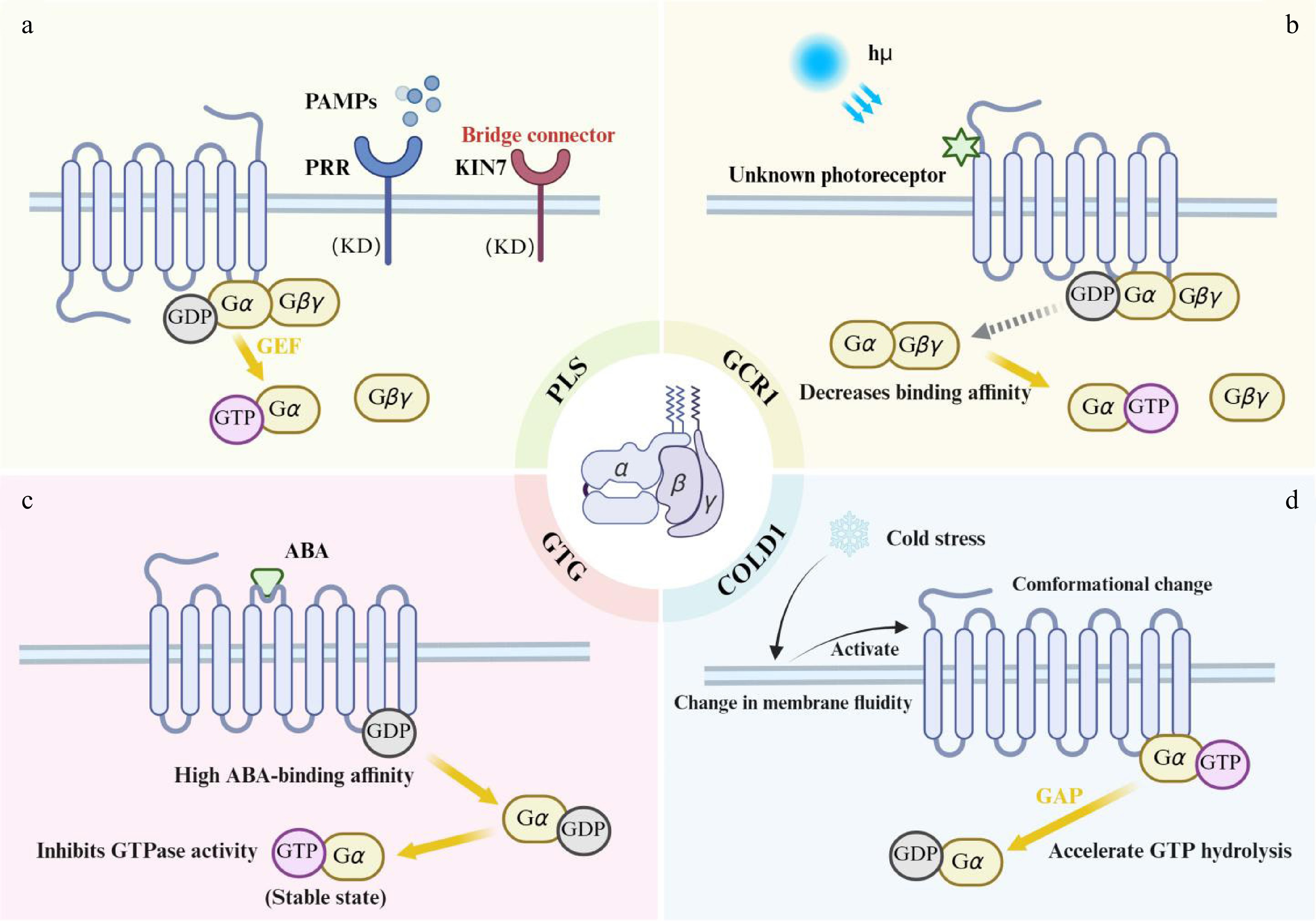 G protein regulatory mechanisms of plant atypical GPCRs. (a) PLS (PAQR-like sensor): pathogen-associated molecular patterns (PAMPs) are perceived by pattern recognition receptors (PRRs). This leads to the formation of a PRR-KIN7-PLS ternary complex, which activates the guanine nucleotide exchange factor (GEF) activity of PLS. Activated PLS catalyzes GDP/GTP exchange on the Gα subunit. (b) GCR1: blue light activates GCR1 via an unidentified photoreceptor. The intracellular domain of activated GCR1 binds to GDP-bound Gα, reducing Gα's affinity for GDP and promoting GDP release. (c) GTG1/2: ABA binds stereoselectively to the high-affinity GDP-bound state of GTG. This triggers GPA1 binding, which inhibits the GTPase activity of GTG, thereby stabilizing the GTP-bound GTG state. (d) COLD1: cold stress increases membrane lipid rigidity, inducing a conformational change in COLD1. Acting as a GAP, COLD1 binds to GTP-bound Gα and accelerates GTP hydrolysis, rapidly generating GDP-bound Gα.