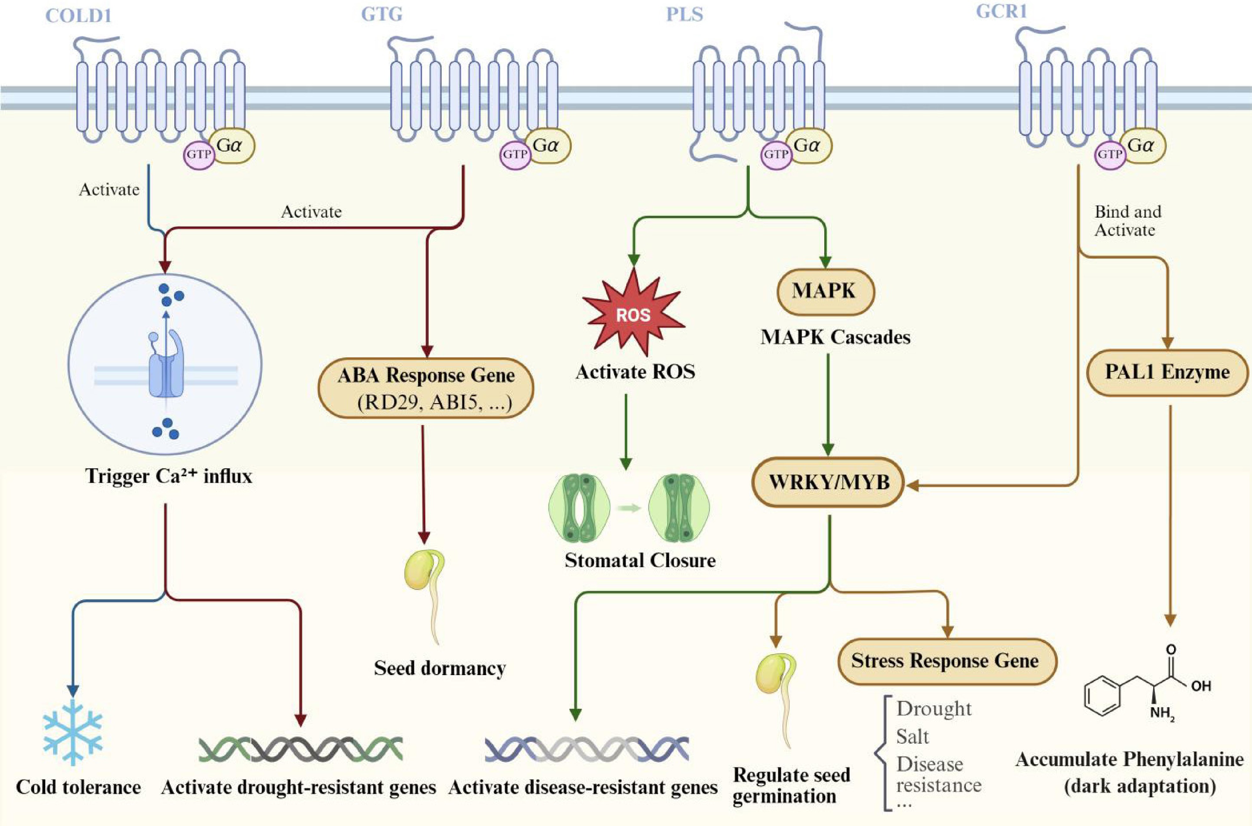 Following perception of blue light, hormones, or stress signals, GCR1 interacts with the heterotrimeric G protein α subunit GPA1, promoting GDP/GTP exchange. This leads to G protein dissociation into GTP-bound Gα and the Gβγ dimer. The activated G protein subunits subsequently regulate downstream effectors. The GCR1/GPA1 signal controls the expression of genes that respond to blue light, stress (like cold, heat, salt, or drought), and hormones. It does this by activating transcription factors like WRKY, MYB, bHLH, and C2H2. This regulatory network mediates processes including seed germination and stomatal movement[50]. In ABA responses, GTG1/2 triggers downstream transcriptional reprogramming through conformation-dependent ABA perception and interaction with GPA1, thereby enhancing stress tolerance.
