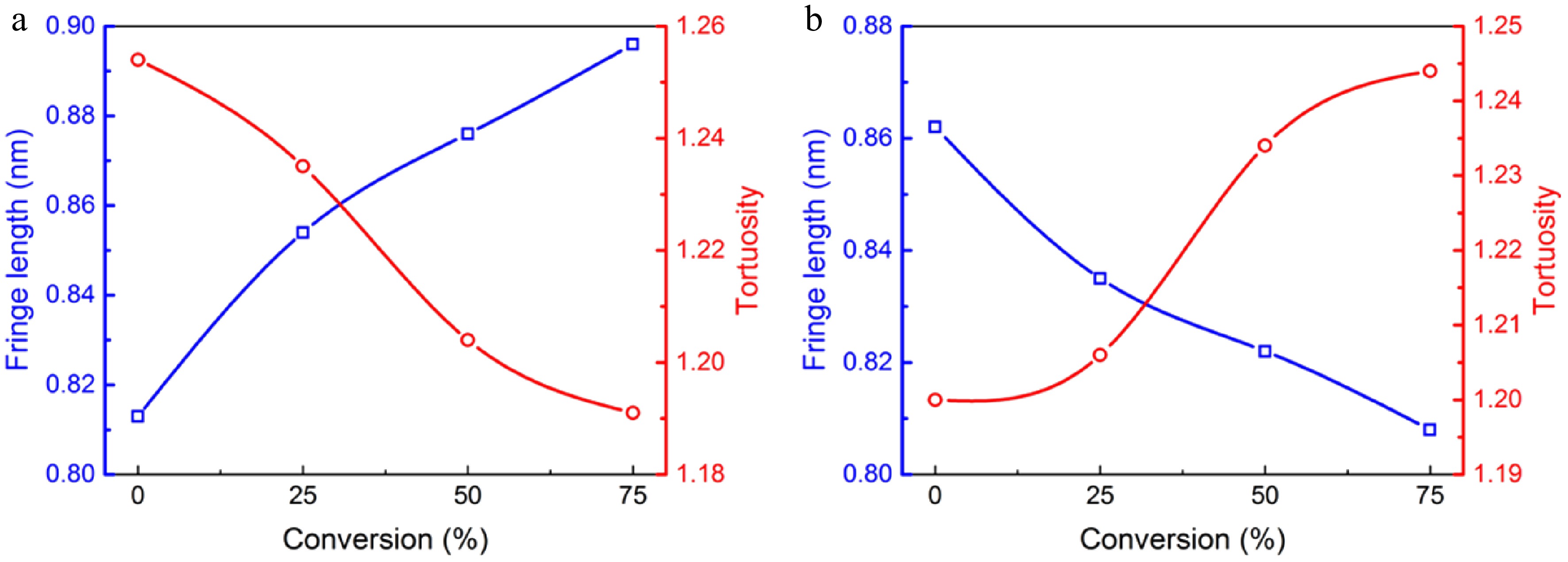 Average fringe length (square), and tortuosity (circle) of soot sampled at (a) 0.4 hf and (b) 0.8 hf as functions of conversion rate.