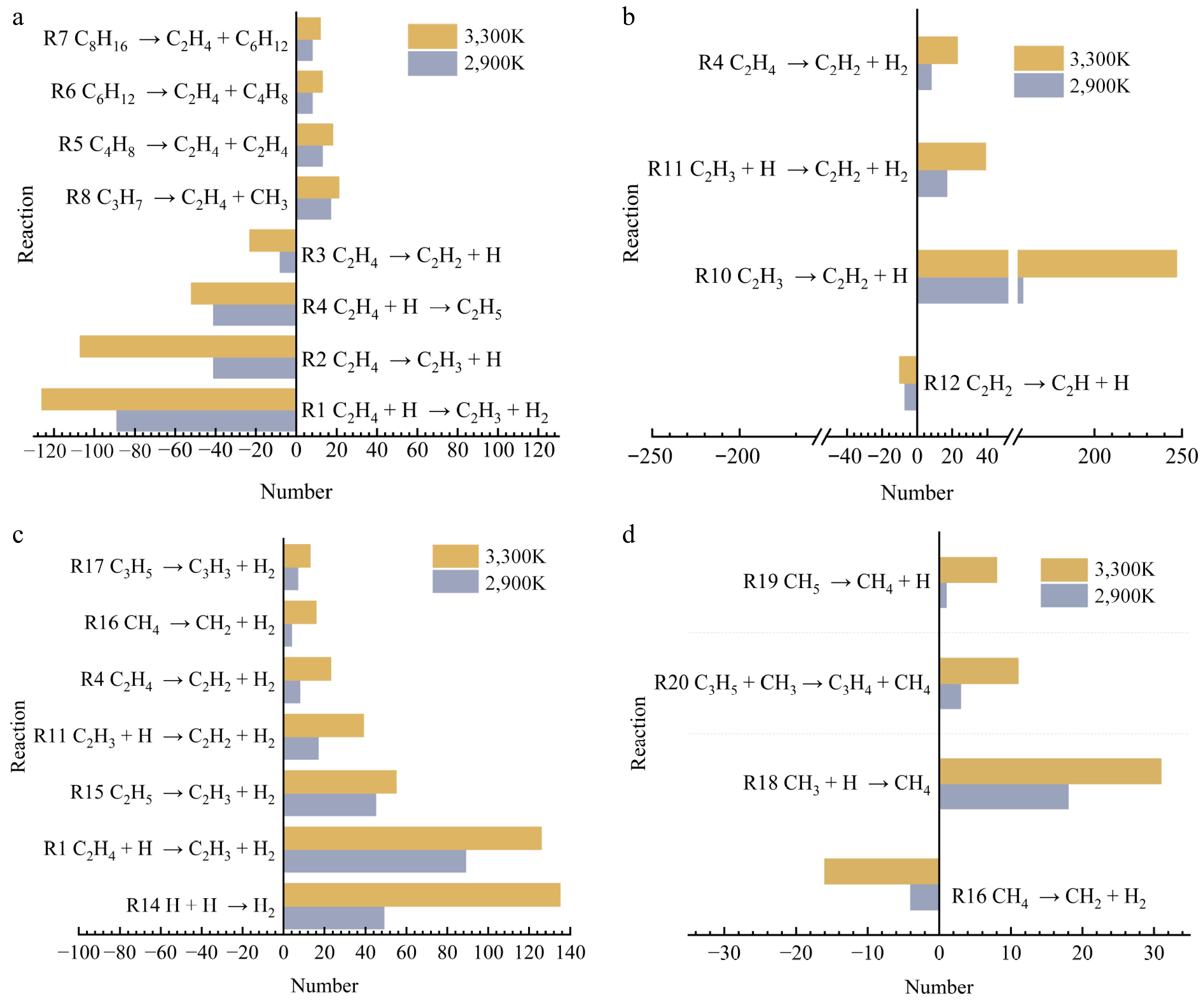 This inhibition enhances with increasing electric field strength, which in turn leads to a negative correlation between the C2H4 peak and the electric field strength. C2H3, C2H2, C2H5, and H2 are generated through R1, R2, R3 and R4. Most of the C2H3 is converted to C2H2 through R10. Under 0.003 V/Å, R1, R3, R4, and R10 are inhibited and R2 is promoted. Under 0.03 V/Å, R1, R2, R3, R4, and R10 are suppressed, which indicates that the pyrolysis of C2H4 is inhibited by the electric field. Under 0.003 V/Å, the hydrogen capture reactions R11 and R14 are promoted, while they are inhibited at 0.03 V/Å. This shows that the electric field affects the PE pyrolysis process by influencing the hydrogen reaction. The main reaction, R18, is less affected by the electric field. However, R19 and R20 are more affected by electric fields, especially under 0.003 V/Å. This suggests that the addition of an electric field causes some particles to crack and produce CH4. In conclusion, the type of polyethylene pyrolysis end product is unaffected by the electric field. However, the key reaction is affected, which affects the PE pyrolysis process. To further investigate the combined effect of temperature and electric field, the electric field and temperature are set to 0.003 V/Å, 2,900 K, and 3,300 K, respectively. The changes in the number of pyrolyzed molecules and chemical reactions are shown by Figs 9 and 10.