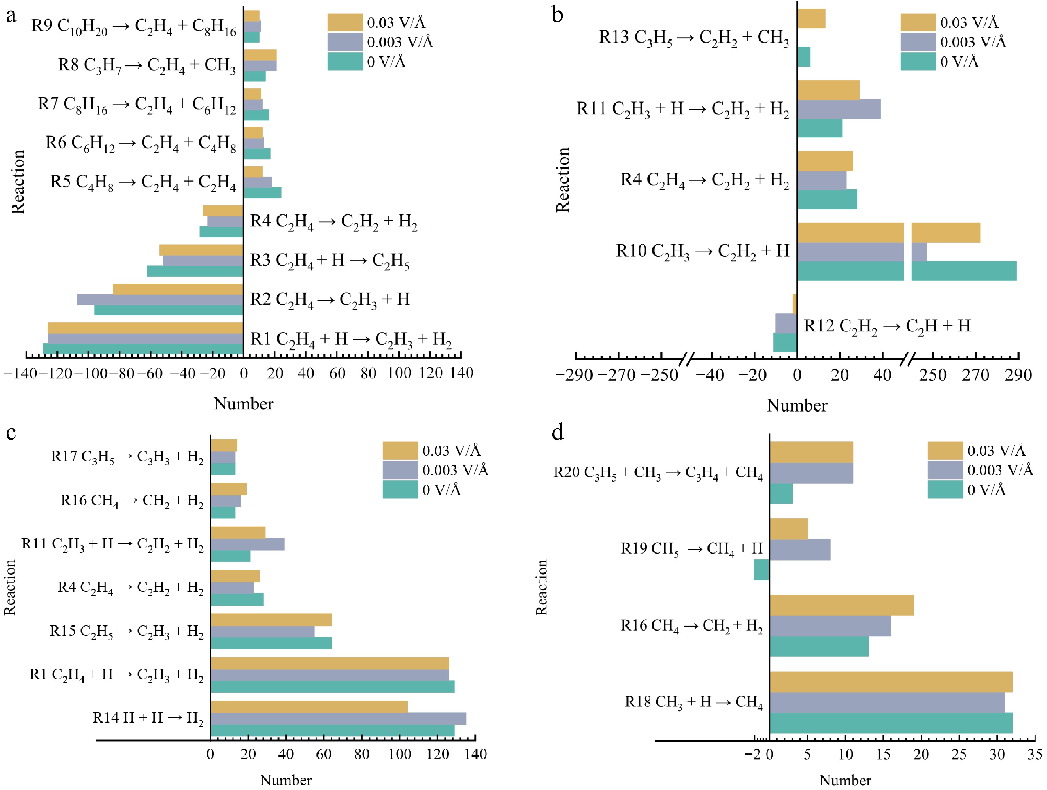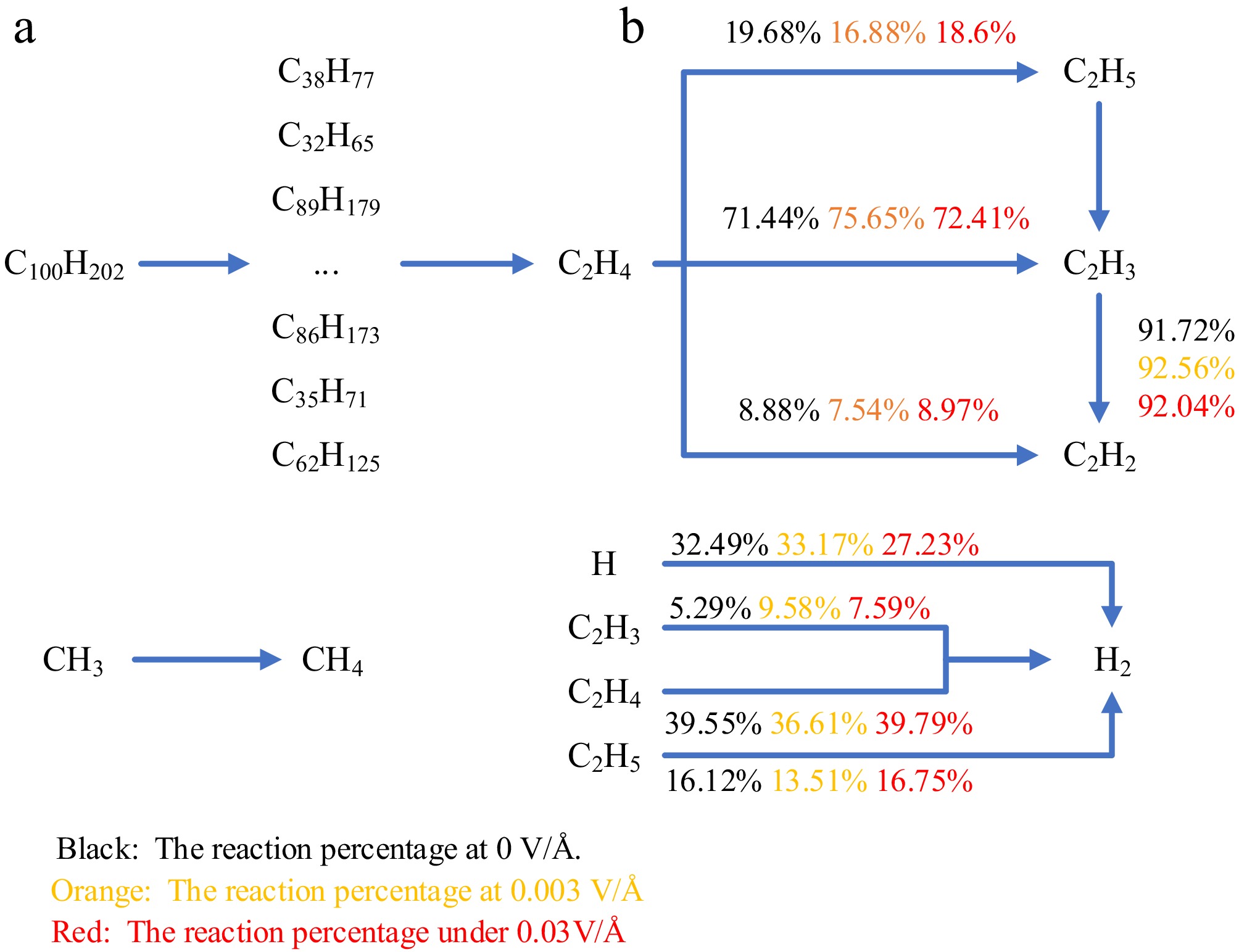 In order to study the main pathways of PE pyrolysis and the effect of the electric field, Supplementary Table S2 is plotted. As shown in Supplementary Table S2, pyrolysis of PE rarely produces ethylene C2H4 directly. Instead, it mainly produces large molecules such as C35H71, C65H131, C32H65, and C68H137 through the decomposition process. These larger molecules are further decomposed into smaller particles, and finally, C2H4 is generated. This finding suggests that PE pyrolysis is a multi-step decomposition process involving the generation and further decomposition of multiple intermediates. These reaction processes are accidental, and there is no obvious trend. At 0 V/Å, PE is mainly pyrolyzed by C-C single bond fracture. A simplified schematic of a potential decomposition pathway for PE to C2H4 is presented in Supplementary Fig. S1 to illustrate the process. However, under the condition of an electric field, PE will break the C-H bond and generate an H radical. This indicates that the electric field reduces the reaction energy barrier of PE initial pyrolysis or increases the energy of PE initial pyrolysis, which causes the C-H bond to break. C-H breaking increases the number of H radicals in the system. H radicals are the reactive radicals in pyrolysis systems and can make the pyrolysis system more reactive.