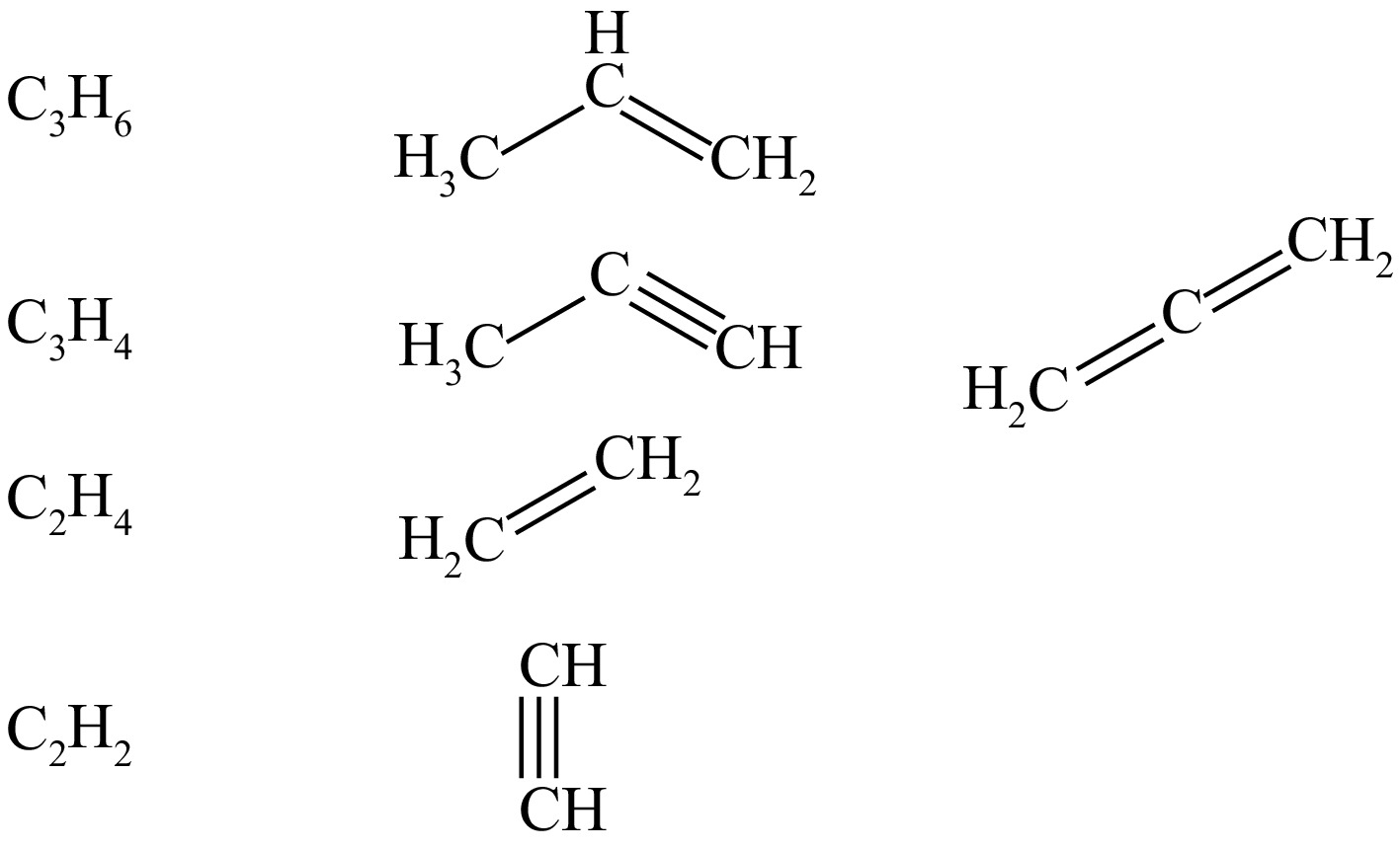 In this paper, the major pyrolysis particles are found to be C2H4, C2H2, H2, C2H3, CH3, CH4, C3H6, C3H5, C3H4, C3H3, and H. Among them, C3H6, C3H5, C3H4, C2H4, and C2H2 are characterized by different structures as shown in Fig. 2. As can be seen in Fig. 2, only C3H4 exhibits isomerization in all these species, which account for a relatively small percentage of the major pyrolysis products, and ultimately C2H2 is produced by thermal decomposition.