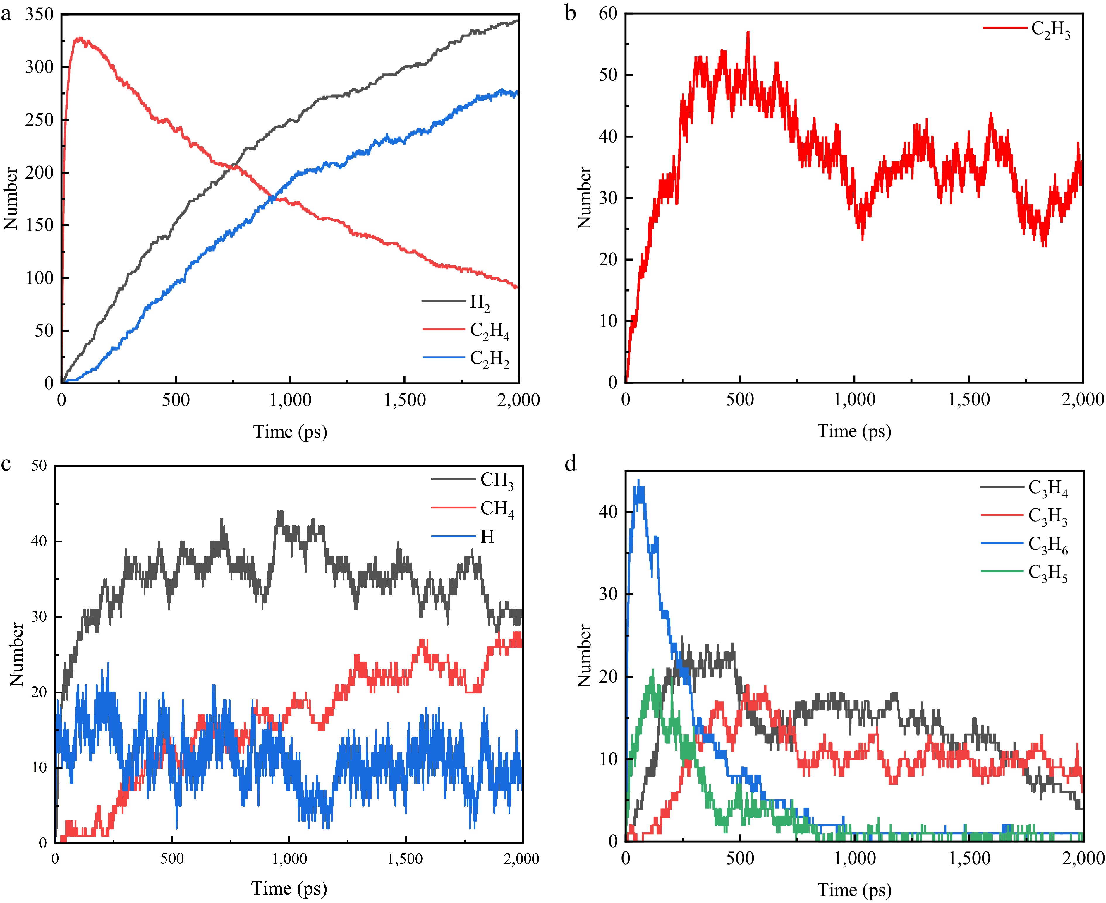 Variation curve of the number of main pyrolysis particles (total number of isomers) with time. (a) C2H2, C2H4, H2. (b) C2H3. (c) CH3, CH4, H. (d) C3H6, C3H5, C3H4, C3H3.