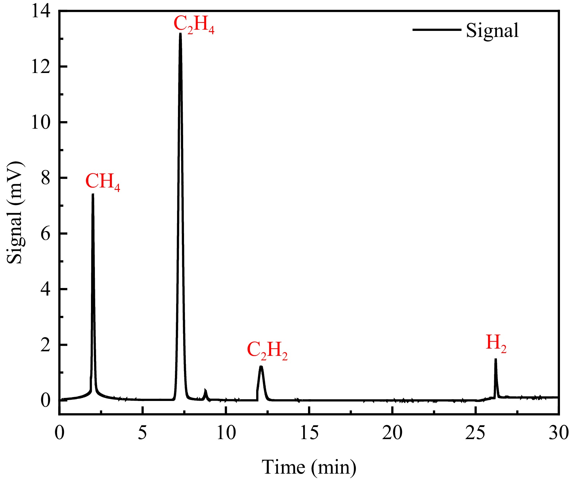 To verify the accuracy of the theoretical calculations, the PE sheath material of a high-voltage cable (YJLW03Z-64/110 KV) is selected for pyrolysis experiments, and the gas products are examined using oil chromatography. Literature is reviewed to determine the major product of PE sheath decomposition, and a standard gas is selected to calibrate the oil chromatogram based on this major product. Since the background gas for the pyrolysis experiment is nitrogen, nitrogen is selected as the background gas for the assay. After completing the calibration, 1 mL of pyrolysis gas is injected for testing and subsequently analyzed for the type of gas and its content. The experimental temperature, experimental atmosphere, airflow purging rate, and temperature increasing rate are set to 30−800 °C, nitrogen, 50 mL/min, and 10 °C/min, which are respectively. As shown in Fig. 4, the detected gas products mainly consist of CH4, C2H4, H2, and C2H2, and it is obvious that the experimental products are consistent with the simulation products.
