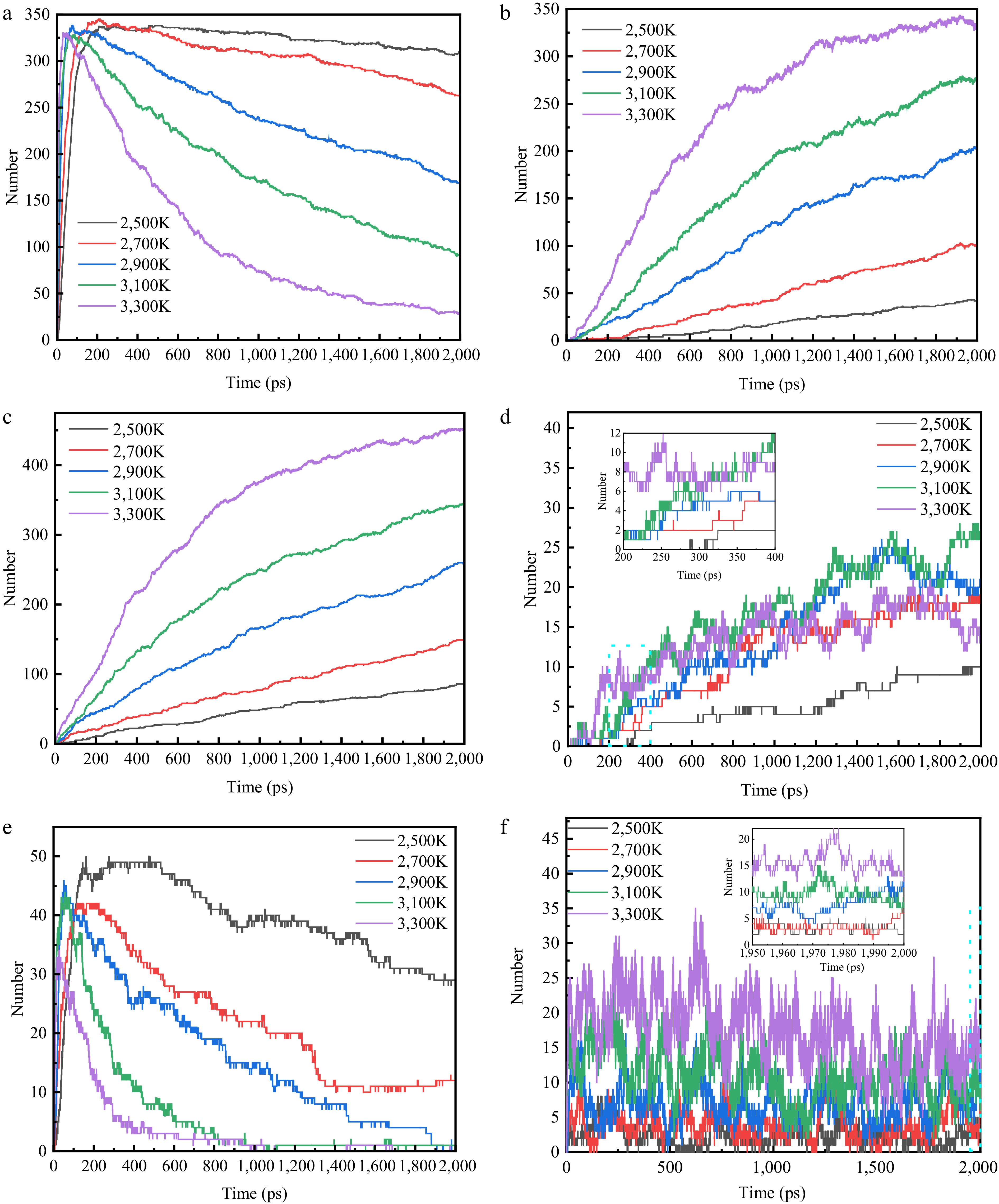 To study the effect of different temperatures on the pyrolysis of the cable sheath, the changes in the number of major products at five temperatures, 2,500, 2,700, 2,900, 3,100, and 3,300 K, are calculated (Fig. 5). The result indicates that the total number of pyrolysis products increases significantly with the temperature. As illustrated in Fig. 5a–c, the alterations in C2H4, C2H2, and H2 are minimal at 2,500 and 2,700 K, suggesting that temperature exerts a negligible influence on the pyrolysis products at low temperatures. Figure 5d shows that CH4 varies less between 2,700 and 3,300 K. In comparison, the number is significantly lower at 2,500 K, indicating that less CH4 is generated at low temperatures, and its number increases significantly and stabilizes beyond a certain temperature. As shown in Fig. 5e, the trend of the number of C3H6 is approximately the same as that of C2H4. This indicates that C3H6 is also an intermediate product, but it is completely decomposed as the temperature increases. Figure 5f reveals a significant increase in the concentration of H atoms with increasing temperature, suggesting a further increase in the vigor of the reaction. This indicates that the breakage of PE long chains is accelerated at high temperatures, generating a large number of substituents (e.g., C2H3 and C2H5) as well as H atoms, which leads to an increase in the total number of molecules in the system.