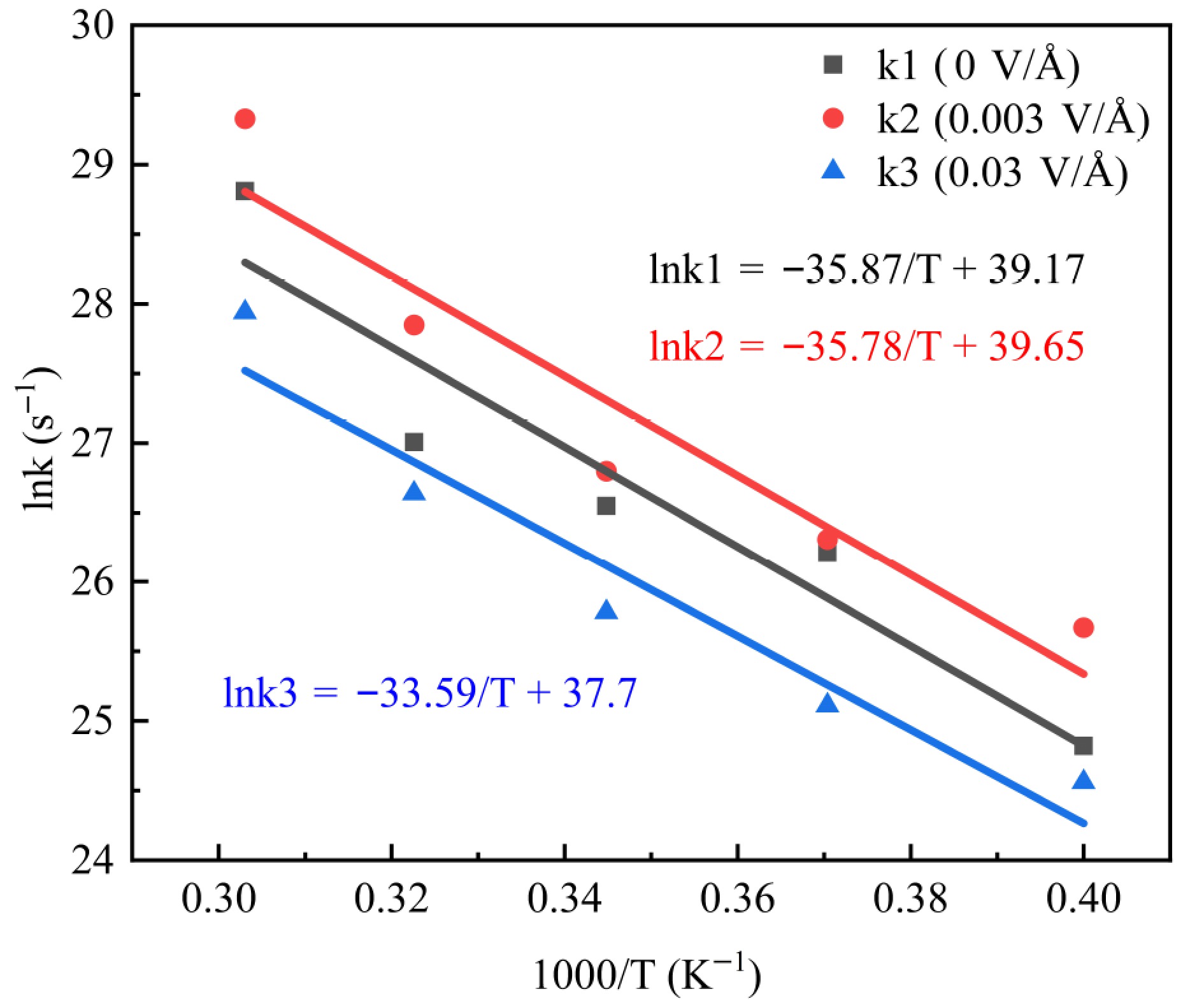 Temperature (K) 2,500 2,700 2,900 3,100 3,300 0 V/Å 6.01 × 1010 2.41 × 1011 3.39 × 1011 5.37 × 1011 3.25 × 1012 0.003 V/Å 1.41 × 1011 2.67 × 1011 4.36 × 1011 1.24 × 1012 5.47 × 1012 0.03 V/Å 4.63 × 1010 8.04 × 1010 1.57 × 1011 3.71 × 1011 1.36 × 1012 According to the Arrhenius equation, the relationship between k and reaction kinetic parameters can be obtained, as shown in Eq. (2)[37]: