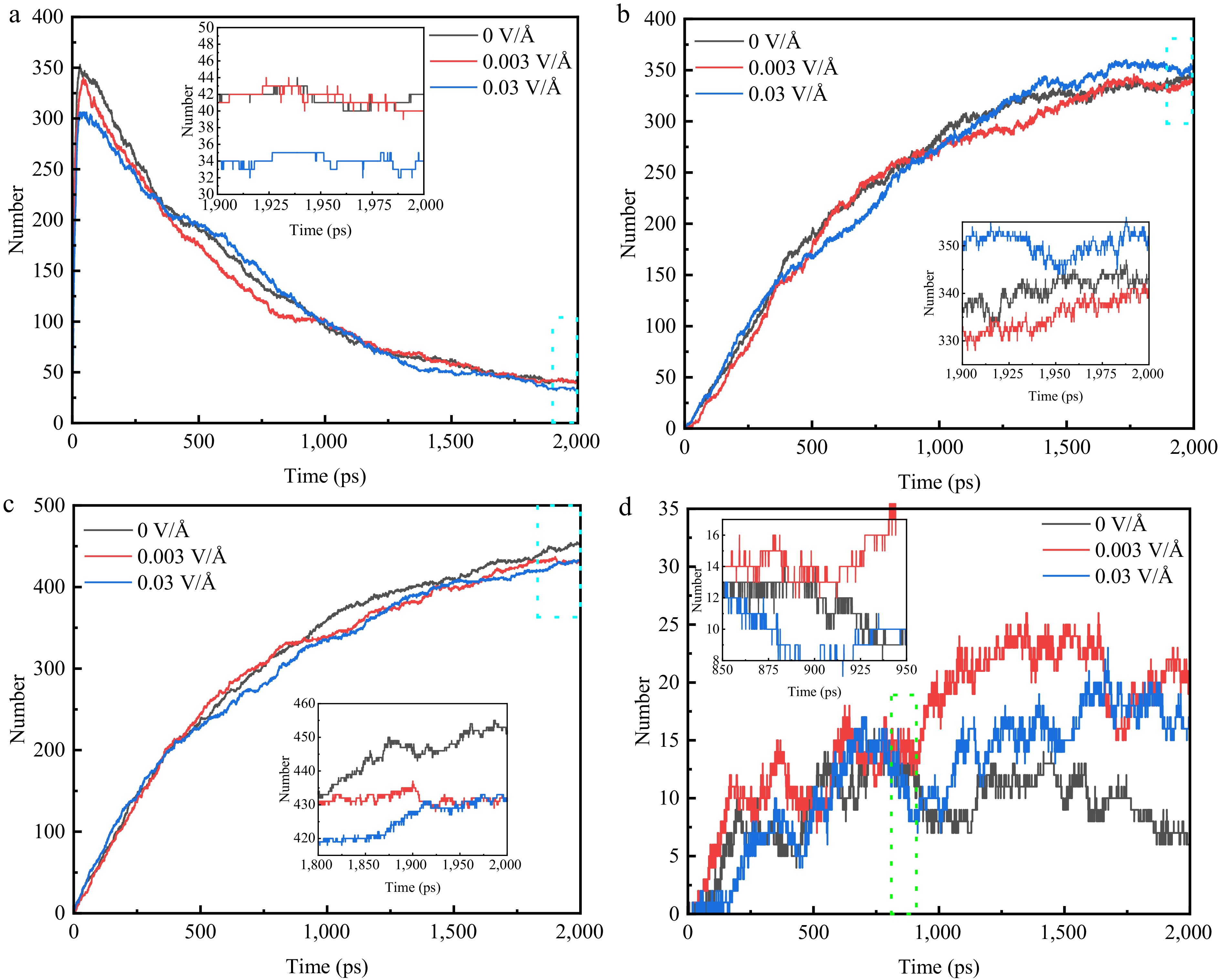 In order to further investigate the effect of electric field on the pyrolysis process, the variation of the amount of pyrolysis products under three electric field conditions, namely 0, 0.003, and 0.03 V/Å, is studied at a constant temperature (3,300 K), and the results are shown in Fig. 7. As illustrated in Fig. 7a–c, no significant change in the number of C2H4, C2H2 and H2 occurs under the influence of the electric field. This indicates that the effect of the electric field on the three final products is not obvious. As shown in Fig. 7d, the amount of CH4 under electric field conditions increases significantly after 800 ps. The amount of CH4 at 0.003 V/Å increases rapidly from 800 to 1,500 ps and then stabilizes, while the amount of CH4 at 0.03 V/Å always shows an increasing trend. However, due to the small amount of CH4 produced, it is more prone to chance inaccuracy. To investigate changes in the amount of CH4, changes in the amount of its intermediate products are analyzed. The variation in the number of its major intermediates, CH3, CH2, C2H4, and C2H3, has been studied, and it has been found that conversion of other intermediates (C4H9, C3H6, C3H5, C3H4, CH5, etc.) to CH4 occurs in the presence of an electric field. The number of decompositions of CH4 into CH2 increases from 17 to 22. There are some differences between the different electric fields, with no significant change in the amount of CH3 present at 0.003 V/Å, but the conversion of CH3 to CH4 increases from 21 to 28. At 0.03 V/Å, the amount of CH3 increases from 31 to 40, resulting in an increase in the amount of CH4 produced. When the system reacts up to 800 ps, there are sufficient particles present in the system that can be converted to CH4, so that there appears to be some increase in the number of CH4 under the electric field.