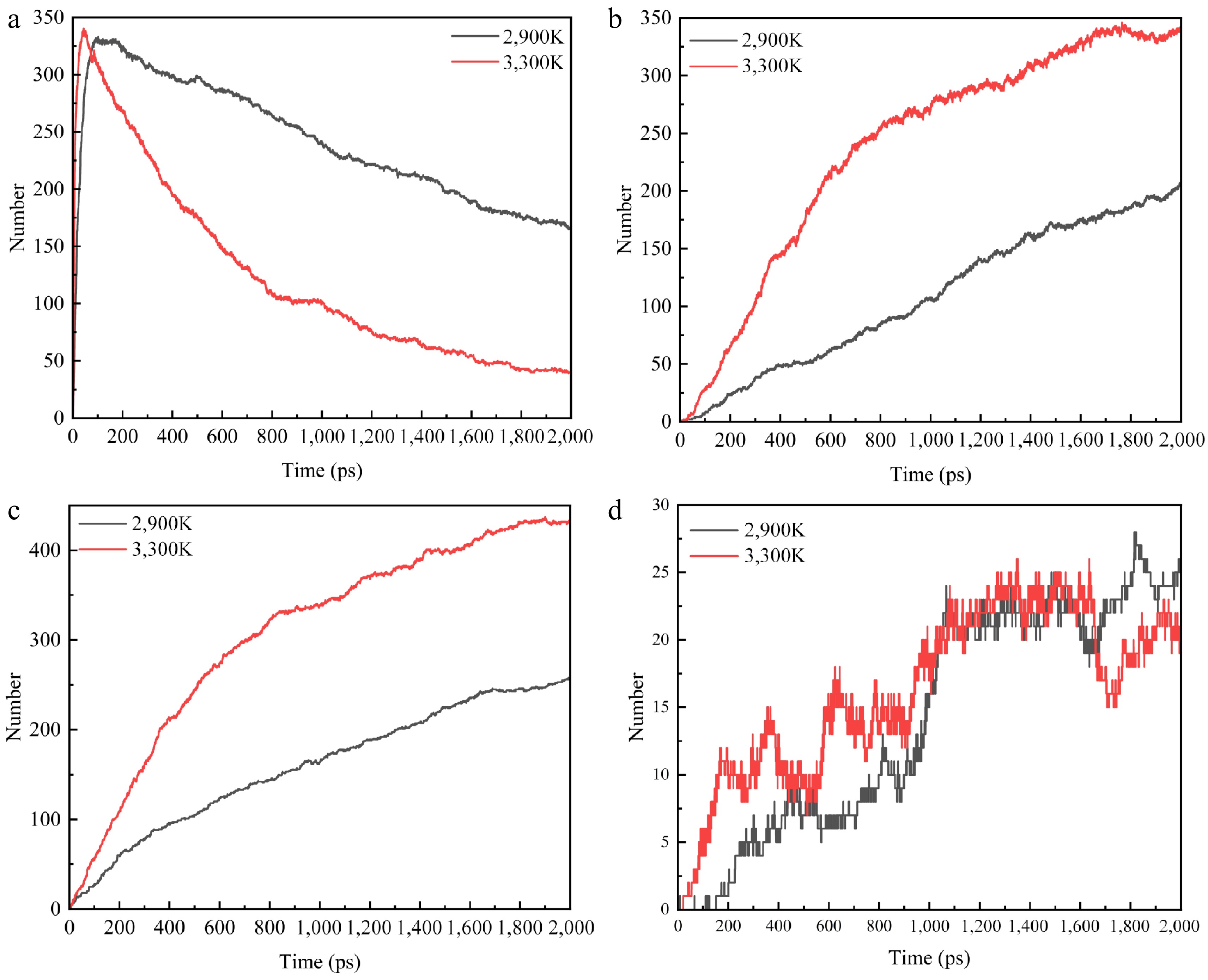 The change rule of the main pyrolysis species C2H4, C2H2, H2, C2H3, CH3, CH4, C3H6, C3H5, C3H4, C3H3, and H under the condition of the temperature of 3,100 K is obtained as shown in Fig. 3. The number of the intermediate product C2H4 increases rapidly within the first 60 ps of the pyrolysis reaction. This is due to the homolytic cleavage of the C-C and C-H bonds in the long-chain molecules of polyethylene, resulting in the production of a large number of alkyl radicals. Long-chain alkyl radicals tend to break at the second carbon (β-carbon) from the radical position. The break produces a C2H4 and a new, shorter alkyl radical. Also, hydrogen transfer within the molecule increases the number of C2H4. After 60 ps, the number of C2H4 shows a significant decrease. C2H4 is unstable at high temperatures and can be further dehydrogenated to form C2H2 and H2. The β-break or hydrogen-robbing reaction may also first produce C2H3, a very reactive radical that can easily lose an H radical to form C2H2. Although acetylene has a high bond energy, its enthalpy of formation is very high, and its high entropy value at high temperatures makes it a dominant product. When two radicals meet and combine, sometimes instead of forming a C-C bond, the two hydrogen atoms combine to form H2, leaving an unsaturated bond (usually a double bond). At higher temperatures, the radical site may seize the hydrogen of neighboring carbons on its own chain, generating a direct double bond and H2 (or H radicals, but H radicals are highly susceptible to bonding to H2). Although not as prevalent as β-fracture, it also contributes to H2 under certain conditions. This stabilizes the number of C2H2 and H2 rising cleavage occurrences near the terminal methyl group of the polymer chain. The resulting CH3 can undergo a hydrogen capture reaction to form CH4. Observation indicates that the C3 (C3H6, C3H5, C3H4, and C3H3) products exhibit a tendency to increase and then decrease. Furthermore, the higher the H content, the more these products disappear completely first. This suggests that the C3 and above particles are unable to exist under these conditions and decompose into products with a smaller number of carbons. The final products are therefore H2, C2H2, C2H4, and a small amount of CH4.