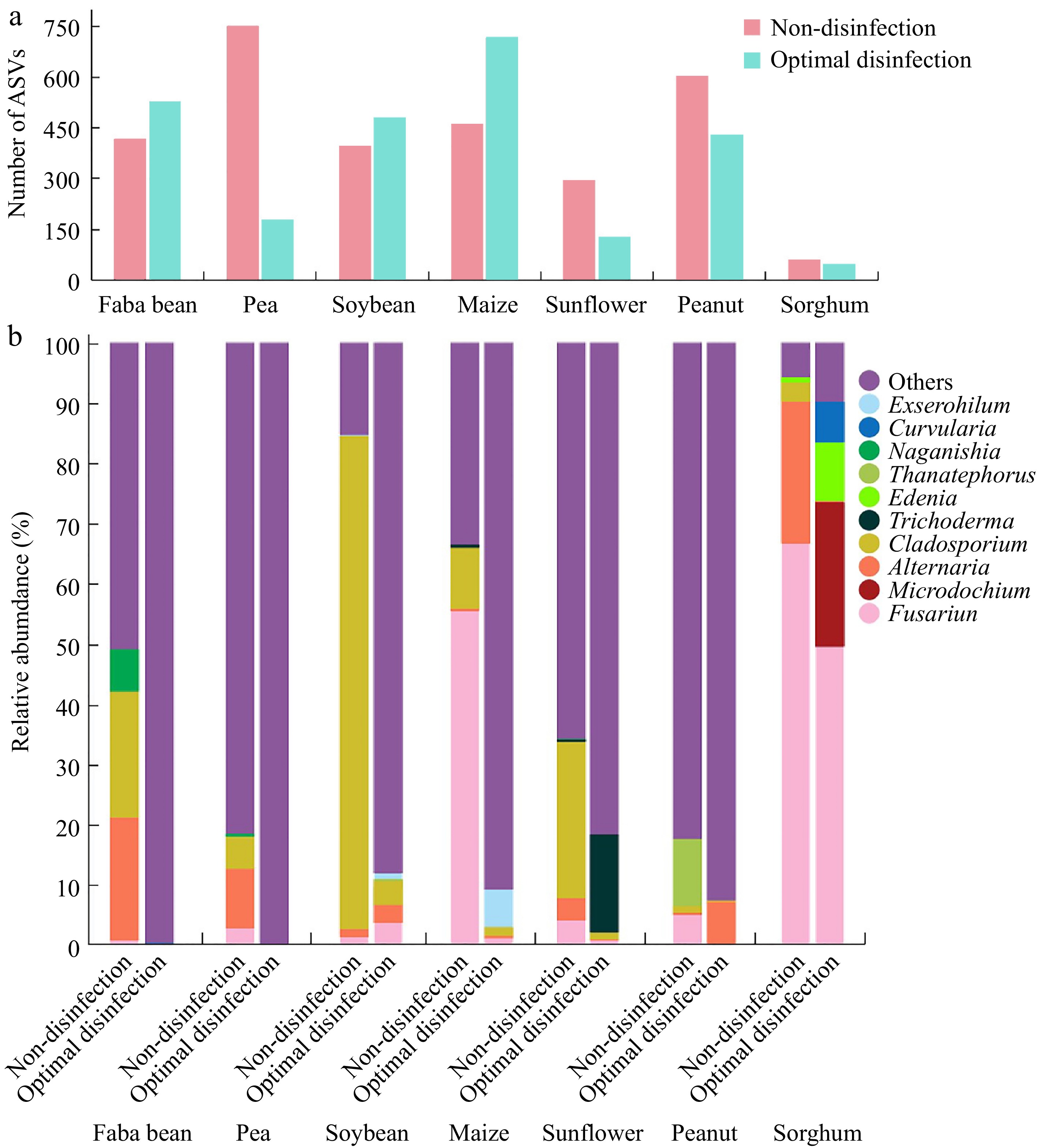 Composition of the major fungi in faba bean ('Tongcanxian 6'), pea ('Zhongwan 06'), soybean ('Zhonghuang 13'), maize ('Nongkeyu 368'), sunflower ('Dwarf edible sunflower'), peanut ('Native species'), and sorghum ('CP21') seeds treated with optimal disinfection protocol and without disinfection as determined through high-throughput sequencing. (a) The number of Amplicon Sequence Variants (ASVs). (b) Relative abundance of major fungal genera.