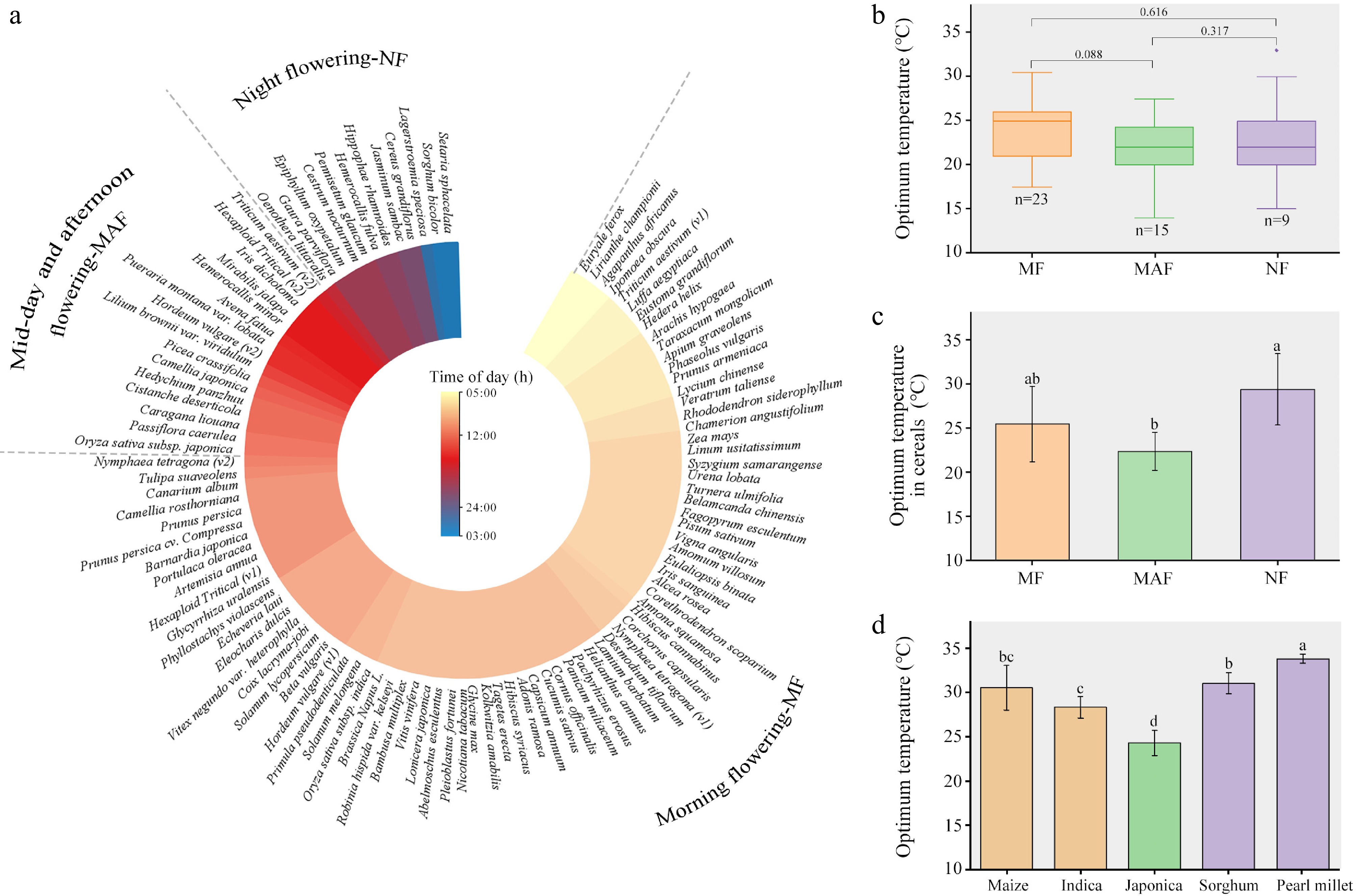 • The high species richness of flowering plants and their rapid diversification are often referred to as 'Darwin's second abominable mystery'. In these flowering plant species, DFOT exhibits diverse characteristics to adapt to complex growing environments (Fig. 2). We collected detailed information about the floret opening times of 102 flowering plant species from published articles, spanning from early morning (5:00) to the next early morning (3:00) (Fig. 2a; Supplementary Table S1). Based on DFOT, we classified these plant species into three groups: early-morning flowering, midday and afternoon flowering, and night flowering groups. Each group includes both dicots and monocots. To examine the responses of these groups to temperature during floret opening, we collected their optimum temperatures for floret opening. There was no significant difference in the mean optimum temperature for floret opening between the groups, but there was considerable variation within each group, likely attributable to their differences in the floret structure (Fig. 2b). To reduce/avoid confounding effects of the floret structure, we further compared optimum temperature for floret opening in three groups that are only comprised of cereal plants (Fig. 2c). The mean optimum temperatures of each group are 26.1, 22.3, and 29.3 °C, respectively, with significant differences. We selected five representative cereal crops for comparison. Maize and indica rice are classified as morning-flowering crops, japonica rice as midday and afternoon flowering crop, and sorghum and pearl millet as night-flowering crops. According to previous reports and data calculation[4047], the respective optimum flowering temperatures of these five crops are approximately 30.5, 28.3, 24.3, 31, and 33.75 °C, respectively (Fig. 2d).