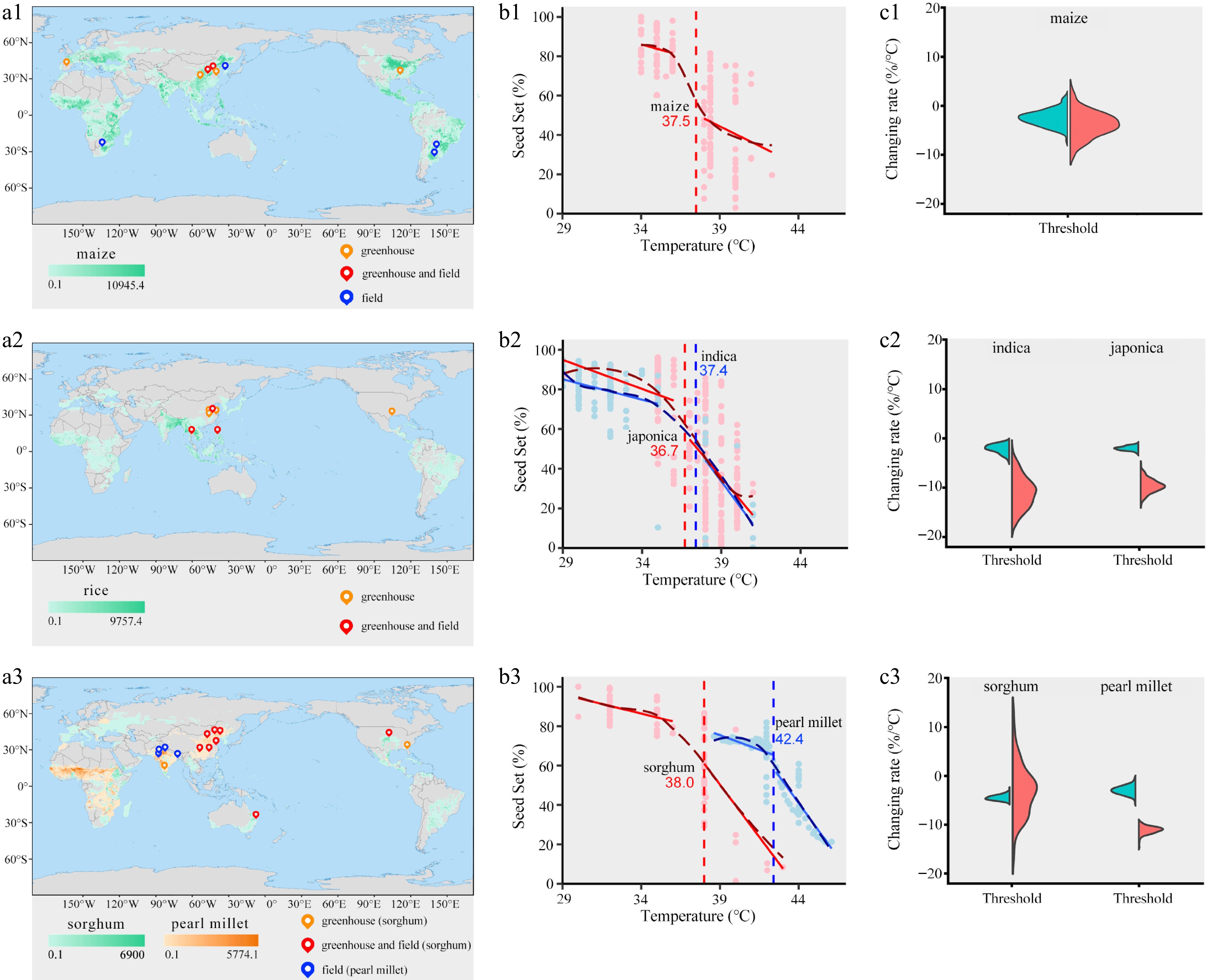 • Given their similarity in the floret structure and the frequency of exposure to heat stress events during flowering, we focused on cereal crops, including maize, rice, sorghum, and pearl millet. Maize tassels and indica rice proceed with floret opening in the morning, while japonica rice opens florets in the midday. Sorghum and pearl millet open their florets either at night or in the early morning. We collected published results concerning the effects of high-temperature stress on seed set in these four crops globally and identified their respective temperature thresholds (Fig. 3a1a3; Supplementary Table S2).