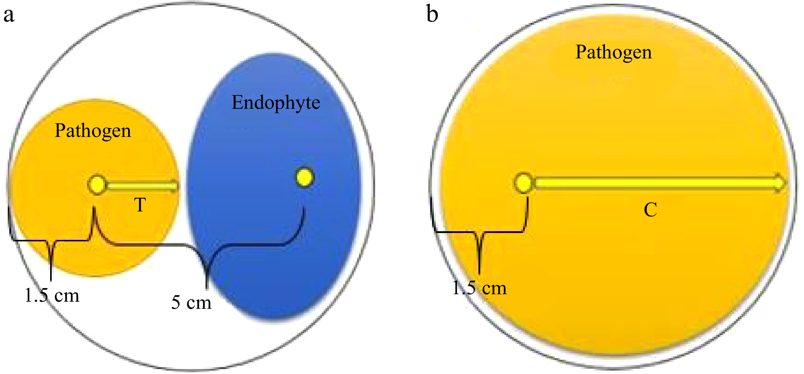 Dual culture technique for testing the biocontrol potential of endophytic fungi against fungal phytopathogens. (a) Dual culture plate. (b) Control plate.