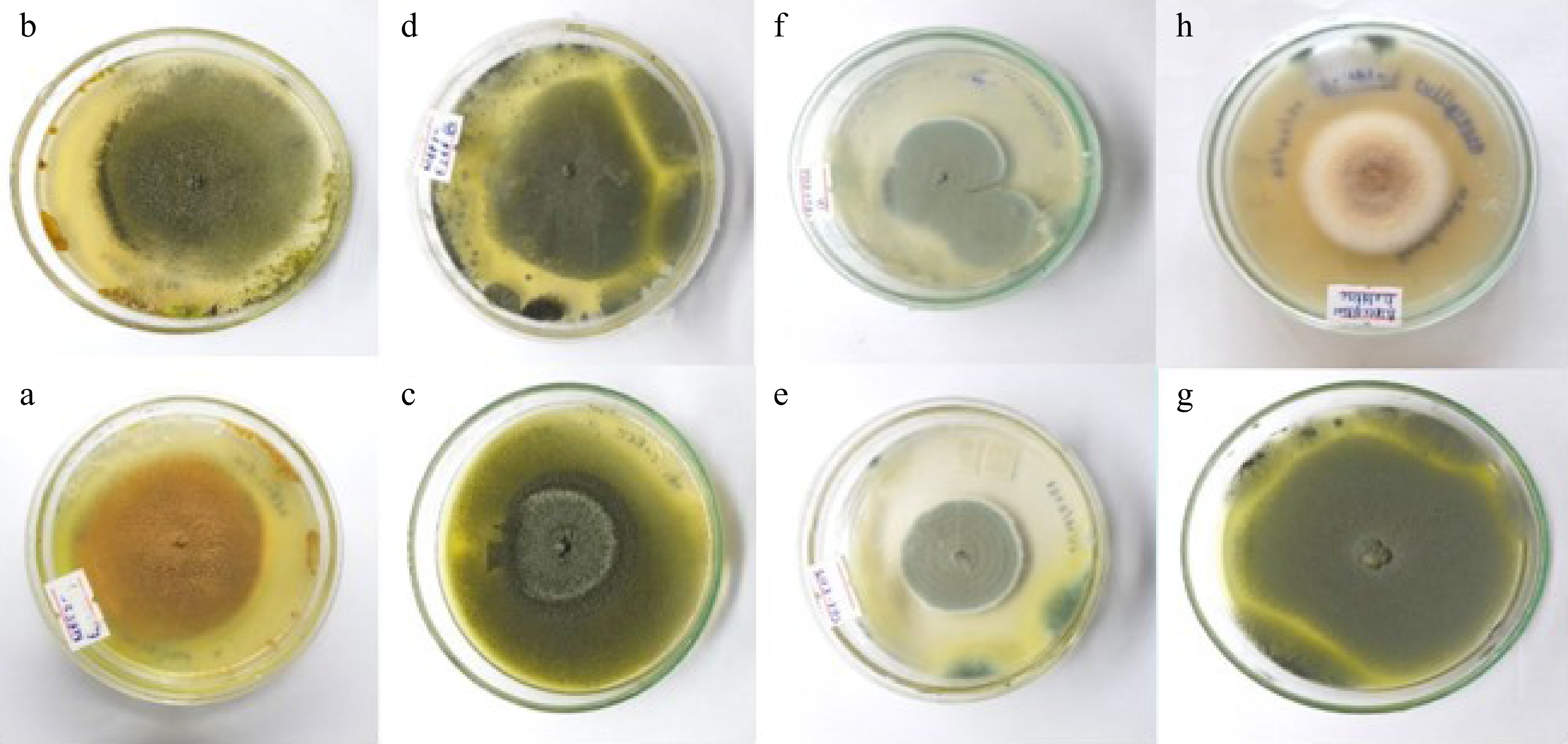 Culture characteristics of isolated endophytes on PDA at 28 °C. (a) Aspergillus sp. (GMBUCC 24–006). (b) Aspergillus sp. (GMBUCC 24–007). (c) Aspergillus sp. (GMBUCC 24–008). (d) Aspergillus sp. (GMBUCC 24–009). (e) Penicillium sp. (GMBUCC 24–010). (f) Penicillium sp. (GMBUCC 24–011). (g) Aspergillus sp. (GMBUCC 24–012). (h) Aspergillus sp. (GMBUCC 24–013).