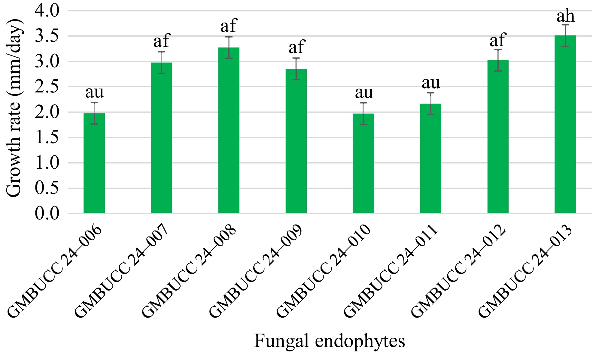 Growth rates of isolated fungal endophytes on PDA at 28 ºC. The bars denoted by the same letters are not significantly different from each other.