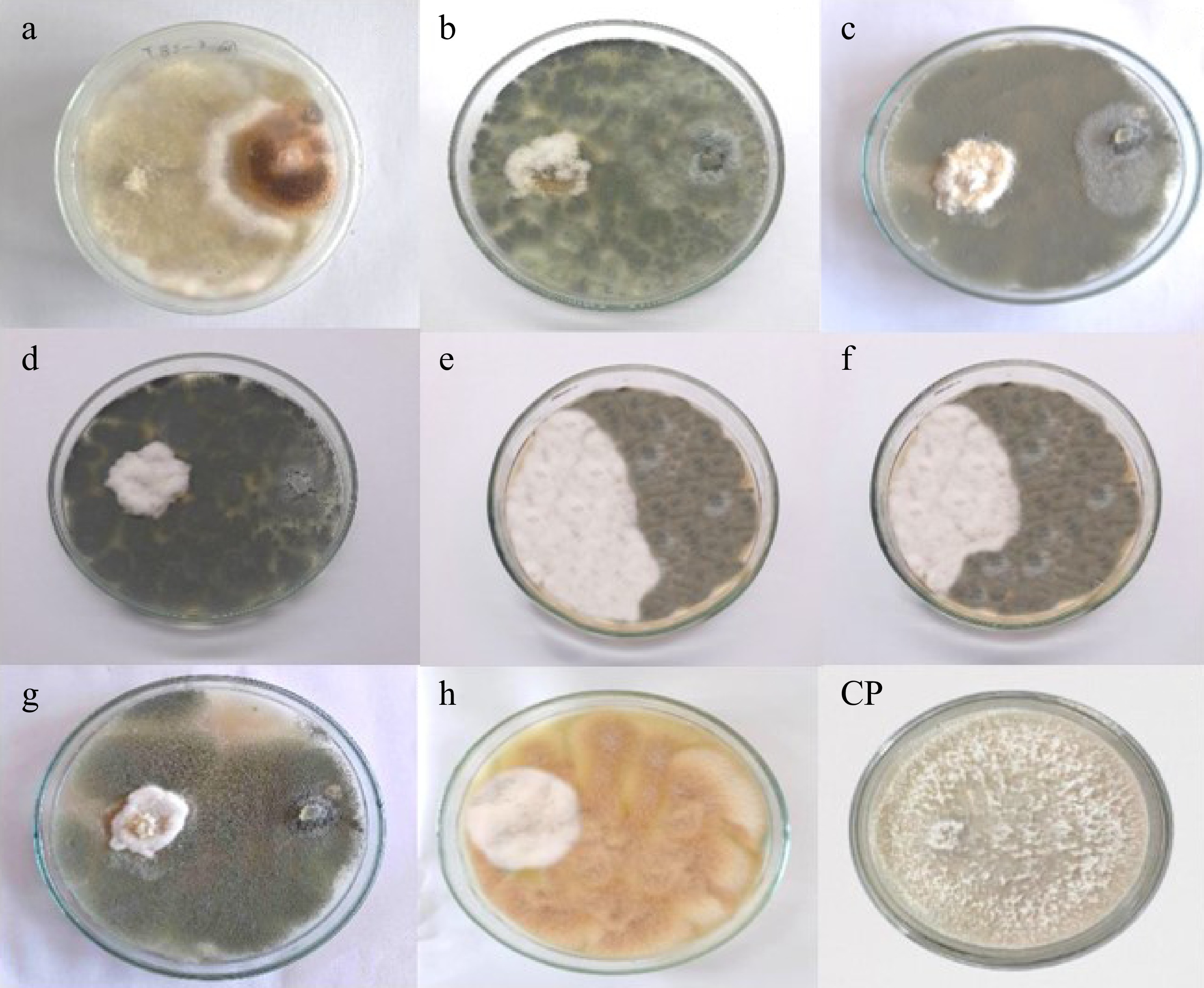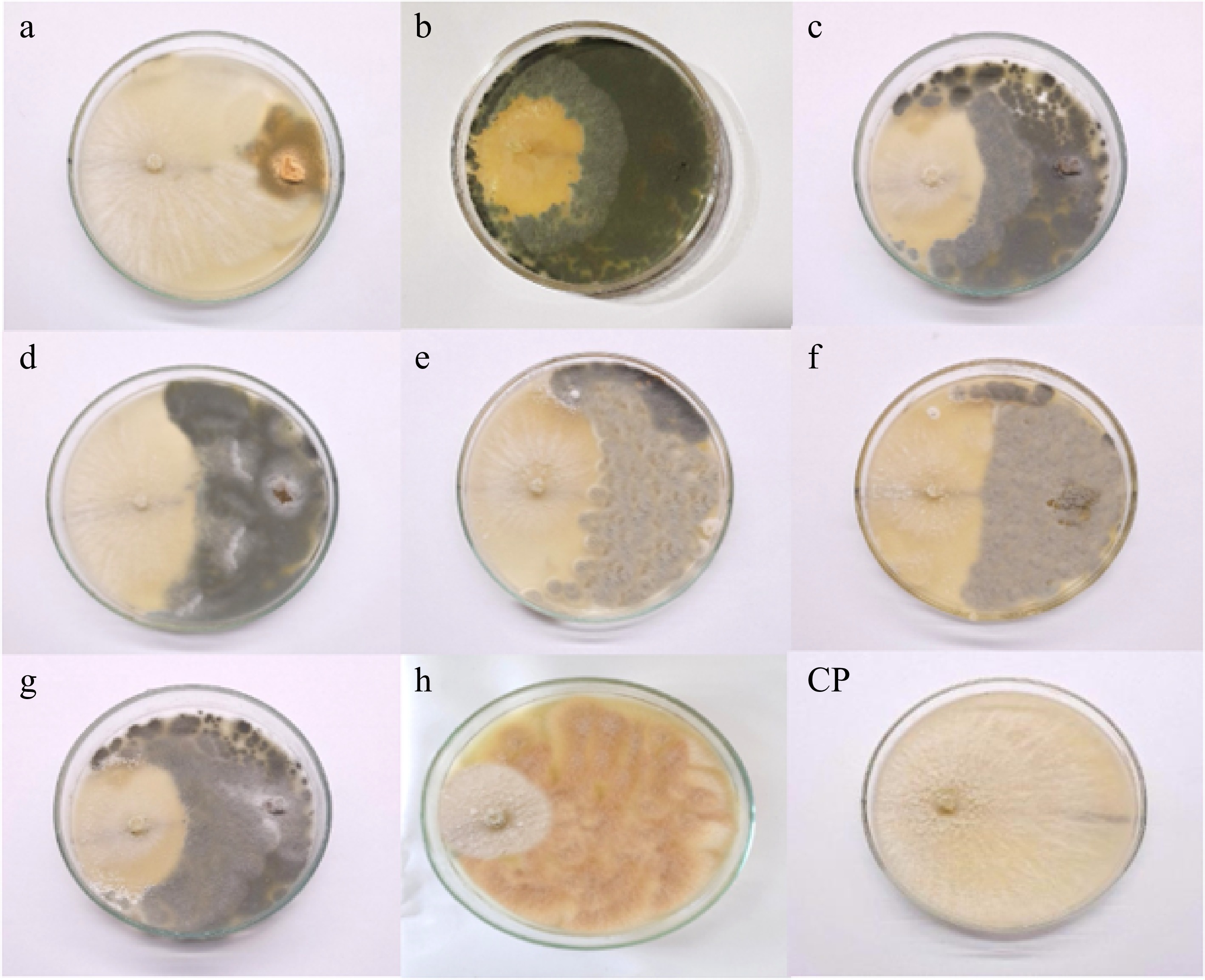 Antagonism between isolated fungal endophytes and Neopestalotiopsis cubana GMBUCC 24–001 (Dual culture plates - a to h) (N. cubana GMBUCC 24–001on the left and fungal endophytes on the right side). (Fungal endophytes in plate; (a) GMBUCC 24–006. (b) GMBUCC 24–007. (c) GMBUCC 24–008. (d) GMBUCC 24–009. (e) GMBUCC 24–010. (f) GMBUCC 24–011. (g) GMBUCC 24–012. (h) GMBUCC 24–013. (CP) Control Plate (N. cubana GMBUCC 24–001).