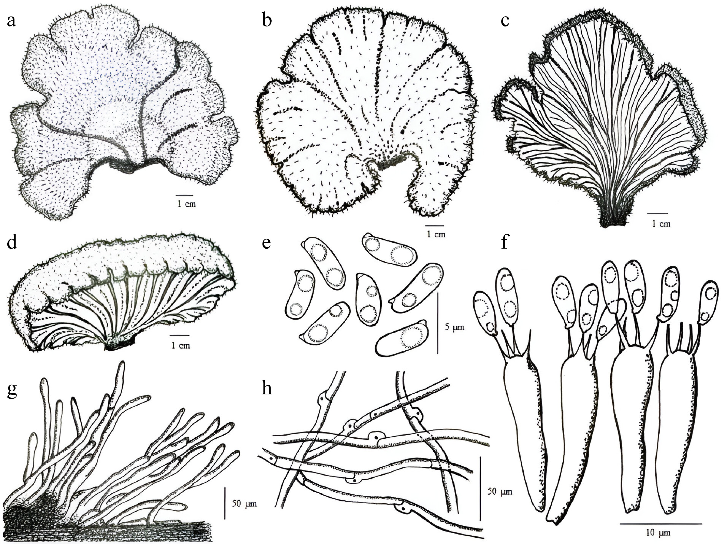 Special Notes: Solitary, sub gregarious to gregarious; on decaying hardwood sticks and logs and is extensively scattered in North America and worldwide. They are saprophytic on dead wood but can be parasitic on living wood. Fruiting body is 1–5 cm broad; fan-shaped when attached to the side of the log; irregular when attached above or below; small hairs are present covering the upper surface, dry, white to grayish or tan; under the surface composed of gill-like folds that are split down to the middle, whitish to grayish; without a stem; flesh tough, leathery, pale. Spore print white. Spores 3–4 × 1–1.5 μm; circular to elliptical; smooth. Cystidia is absent. Pileipellis is 3–6 μm wide. Clamp connections are present[20−22].