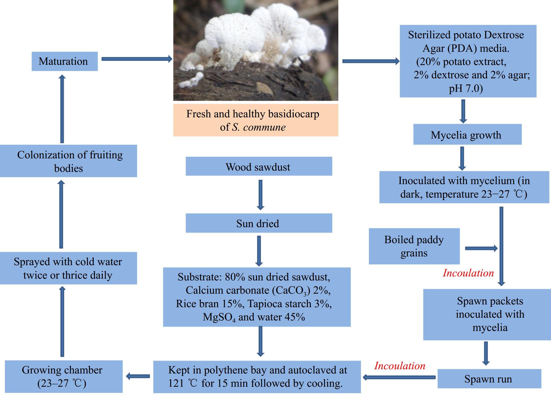 Wild mushrooms may contain high nutritional parameters and pharmacologically efficient biomolecules, which can cause huge requirements for these mushrooms in the commercial field. The total productivity of these mushrooms in their natural habitat is not as much as the commercial need, and S. commune is one of them. This fungus grows abundantly in the rainy season and frequently appears on dead wood. Still, its commercial demand is too high to be fulfilled due to the presence of immune-modulator compounds and nutritive values. Even comparative studies between wild and cultivated varieties of this mushroom showed that only a few nutritional parameters may differ slightly. Still, other than that, vitamins, mineral composition, and bio-active components are similar in both strains. Therefore, it is evident that strain differentiation doesn't interact with mineral composition. Multiple industries, like lather, dairy, detergent, cosmetics, textiles, and bio-fuel industries, also rely on S. commune for its unique biochemical composition. Nowadays, it is used to produce eco-friendly insecticides, flavoring agents, and bio-preservatives, which can reduce the use of life-threatening chemicals regularly. Thus, it is evident that natural dependency is not enough to meet the requirement, and as an alternative process, no other options are left except the mass cultivation of S. commune. Moreover, artificial cultivation has advantages over natural production as we can get a huge flush of fruiting bodies in comparatively less time, and seasonal dependency can also be avoided.