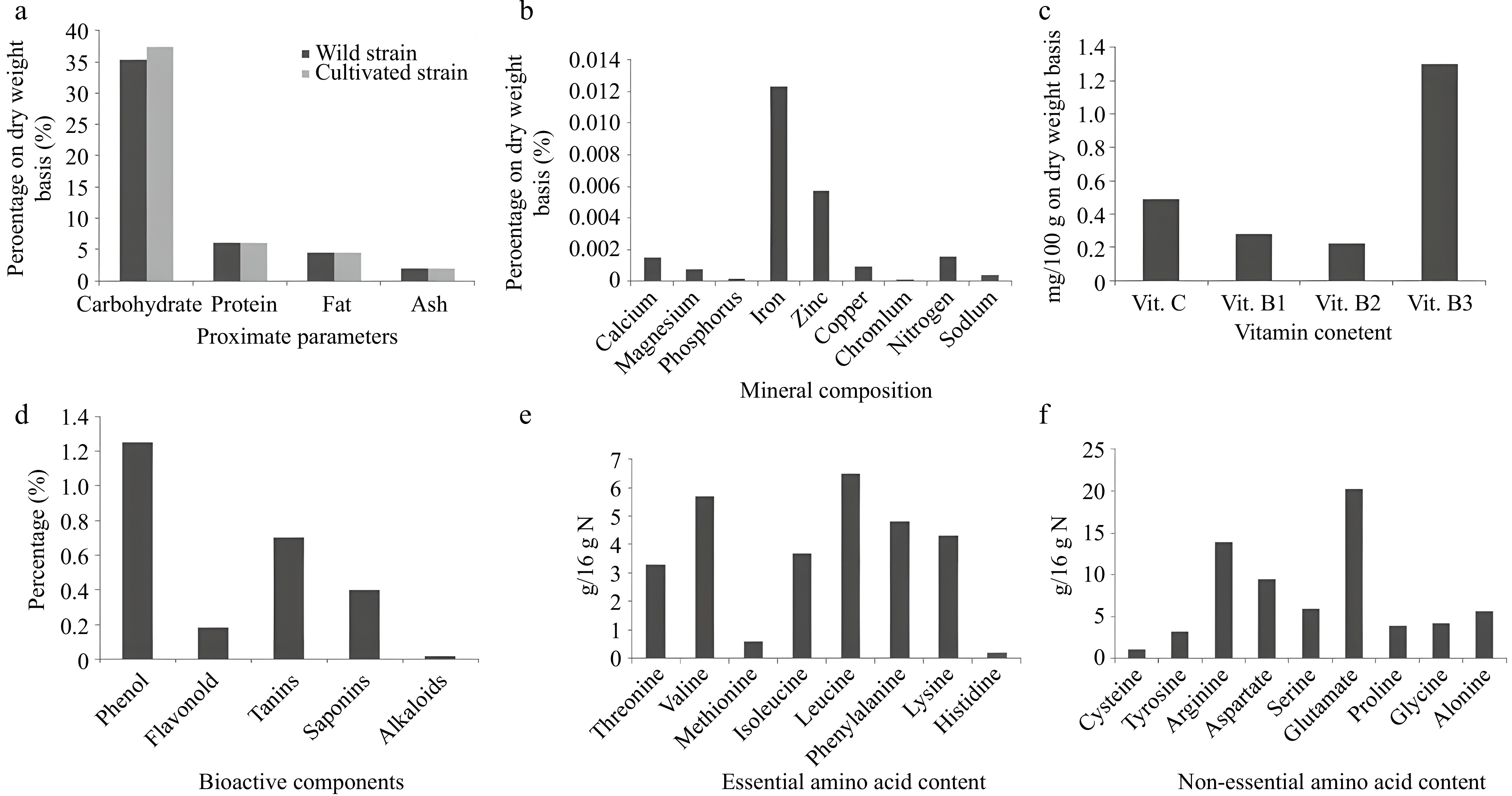 (a) Comparative analysis of the proximate composition of wild vs cultivated strains of S. commune. (b) Mineral composition. (c) Vitamin concentration. (d) Bioactive component composition. (e) Essential amino acid composition. (f) Non-essential amino acid composition of S. commune[32,51−54].