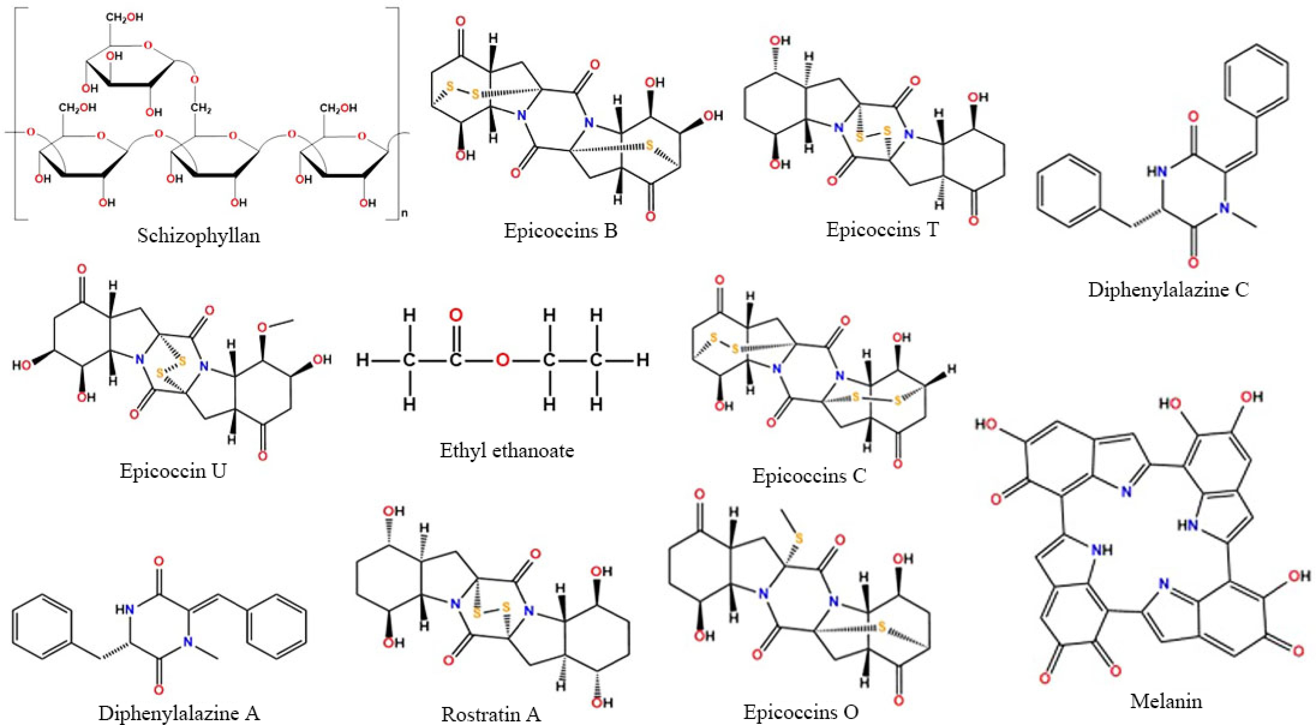 Besides having enormous nutritional value, split gill fungus is also acknowledged for its bioactive components and therapeutic effect. A few biopolymers obtained from the aqueous culture of S. commune, possess pharmaceutical impact. Schizophyllan, hydrophobin, schizocommunin, indirubin, isatin, N-acetyl-d-galactosamine (GalNAc)-specific lectin, indigotin, and tryptanthrin are some of these bio-modifiers extracted from this fungus[52,62]. Each of these shows different chemical properties and proves the presence of a diverse group of biopolymers. Hydrophobins are minute protein molecules that contain eight conserved cysteine residues with a hydrophobic nature. The N-terminus of S. commune Lectin (SCL) is blocked, but sequence similarities could still be seen with plant lectin[62]. Schizocommunin is an indole derivative[52] whereas schizophyllan is a triple-stranded helix protein that dissolves in water. Schizophyllan is the most widely studied biopolymer (glucan) of S. commune and alternatively known as SPG, sizofilan, sizofiran, and sonifilan. The activity of schizophyllan depends on 1,3-β-D-Glucan[63]. Its molecular weight, structure, and branching pattern determine efficiency. It is now proven that branched glucans show higher biological response against certain forms of cancer[64]. Diketopiperazines are a group of biopolymers extracted from various mushrooms, including S. commune. Previously the presence of Epicoccin B, Epicoccin C, Epicoccin O, Epicoccin A, Diphenylalazine A, and Rostratin A in split gill fungus was confirmed by Guo et al.[65], and Wang et al.[66], but in recent days two more biopolymers from this group were found to be obtained from S. commune i.e., Diphenylalazine C and Epicoccin U[67]. A few bioactive components and their chemical structures are given in Fig. 6.