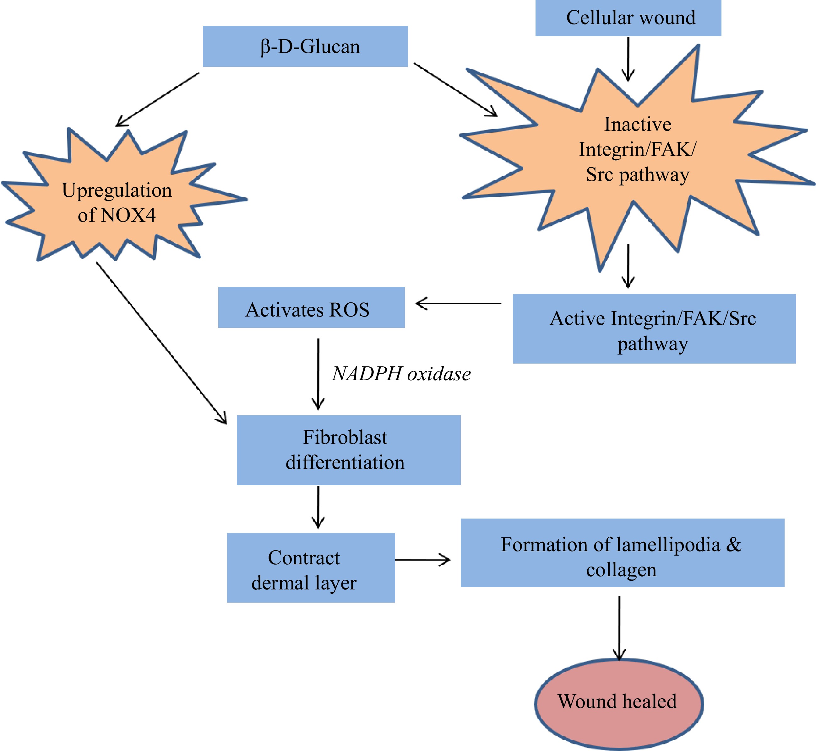 Though multiple immune-modulators and bioactive components are taken together, reports suggest that the mechanism of action of each one of these compounds is distinct from the other. Out of these, a few compounds and their working principles are well illustrated, whereas other mechanisms of action are still undiscovered. Here in this article, the mode of action of β-D-Glucan is described, and Figs 7 & 8 suggest the diversified working principle of this novel compound against different medical conditions. β-D-Glucan, while working against cancer[84] will activate MAPK, T lymphocytes, and NF-kB and, through activation of macrophages, can stimulate lymphocytes, which will lead to an apoptotic pathway or cell cycle arrest (Fig. 7). The same compound manifests some different pathways during wound healing activity[90], whereby activation of integrin, the FAK or the Src pathway, fibroblast differentiation is achieved, which, along with up-regulation of NOX4, can produce lamellipodia and collagen, and this eventually heals the wound (Fig. 8).