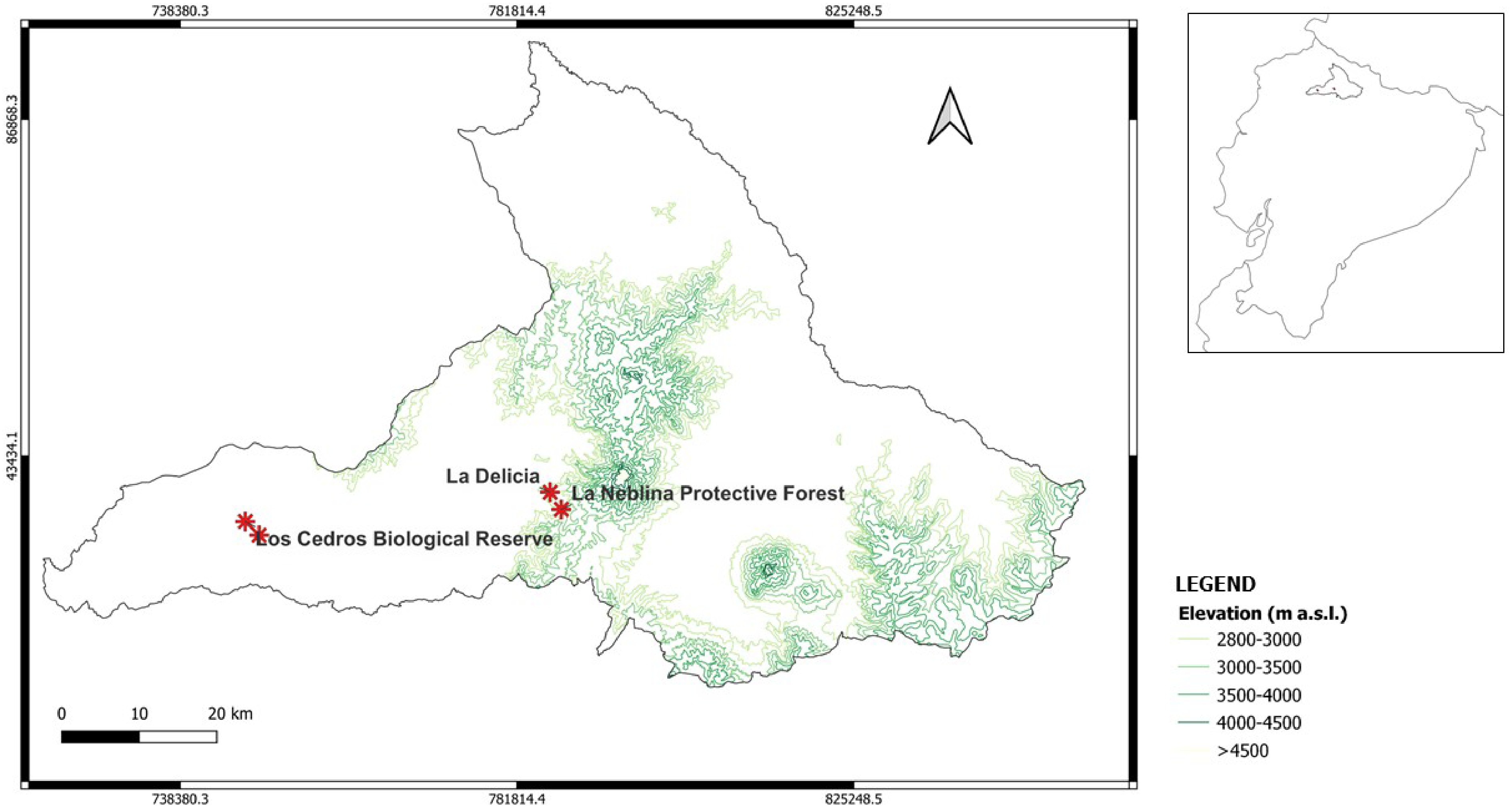 • Samples were collected from four localities near the Cotacachi Cayapas National Park, located within the Andean Chocó biogeographic region in Imbabura province, Ecuador. Due to the sporadic distribution of Cedrela montana (cedar) in the wild, three individuals were selected at each sampling elevational point. To enhance the representativeness of the data, the sampling design included collecting samples from three distinct random points around each tree. This approach ensured that our assessment improved the robustness of the sampling of the rhizosphere micro-community. The sampling points were as follows: (i) Los Cedros Biological Reserve (0°18' N, 78°46' W, ~1,500 m a.s.l.; 0°19' N, 78°47' W, ~2,000 m a.s.l.), (ii) La Delicia (0°21' N, 78°26' W, ~2,500 m a.s.l.), and (iii) La Neblina Protective Forest (0°20' N, 78°25' W, ~3,000 m a.s.l.) (Fig. 1). An auger was used to dig a 20 cm deep hole at three equidistant points from each tree. Around each cedar, up to one-meter diameter was left to ease the collection of soil and fine roots. The collected samples were placed in hermetic bags and stored at 4 °C until laboratory analysis.