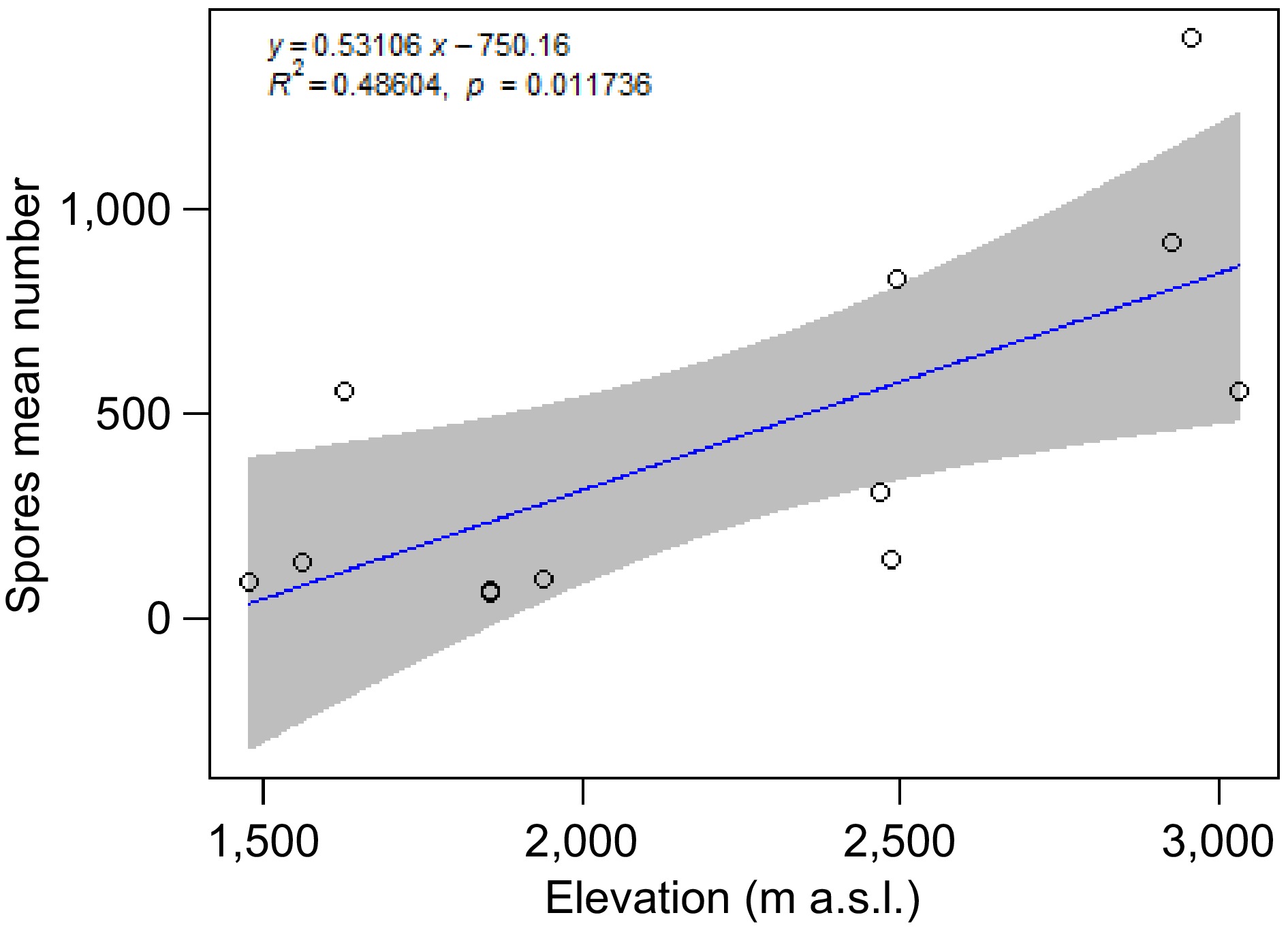 Linear regression correlating spore mean number with elevation, from the rhizosphere of Cedrela montana roots. The regression line (blue) shows a positive trend, with the shaded gray area around the line representing the 95% confidence interval (the equation of the regression line is displayed at the top of the graph).