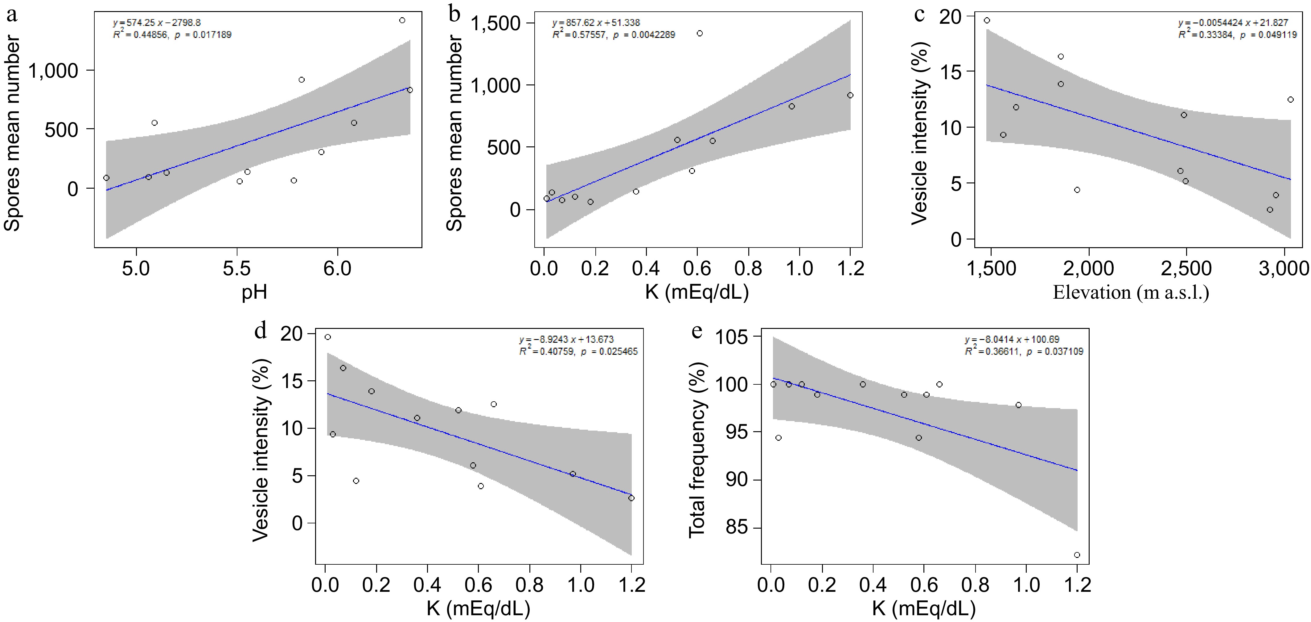 Linear regressions with positive trends: (a) spore mean number with pH, and (b) spore mean number with K. Negative trends are observed for (c) vesicle intensity with elevation, (d) vesicle intensity with K, and (e) total frequency with K, from the rhizosphere of Cedrela montana. Regression lines (blue) are shown with shaded gray areas representing 95% confidence intervals (the equation of the regression line is displayed at the top of the graph).