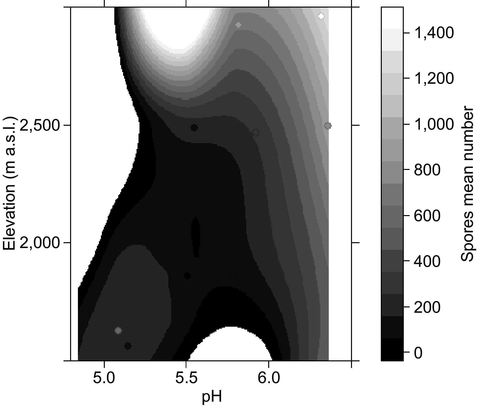 A multifactorial explanation for the relationship between soil conditions and the distribution of AMF spores along elevational gradients may involve several drivers, including soil pH, and soil fertility[19]. In fact, in our study, the highest mycorrhizal spores count was found at pH around 6.0 at 3,000 m a.s.l. in comparison to the values found at lower elevations (pH < 5.5). Previous works have described how this edaphic parameter may influence the mycorrhizal colonization and abundance of these fungi[15,35]. According to Ma et al.[36], the soil pH is a key predictor of the global distribution of AMF abundance. This relationship may be linked to the availability of inorganic phosphorus, which is most accessible at a soil pH of around 6.5. At both lower and higher pH levels, inorganic phosphorus availability is restricted. Additionally, localized changes in rhizosphere pH can further influence the accessibility of these phosphorus sources[17]. Moreover, soil pH is a critical factor due to its essential role in promoting the extension of AMF extra-radical mycelia[9].