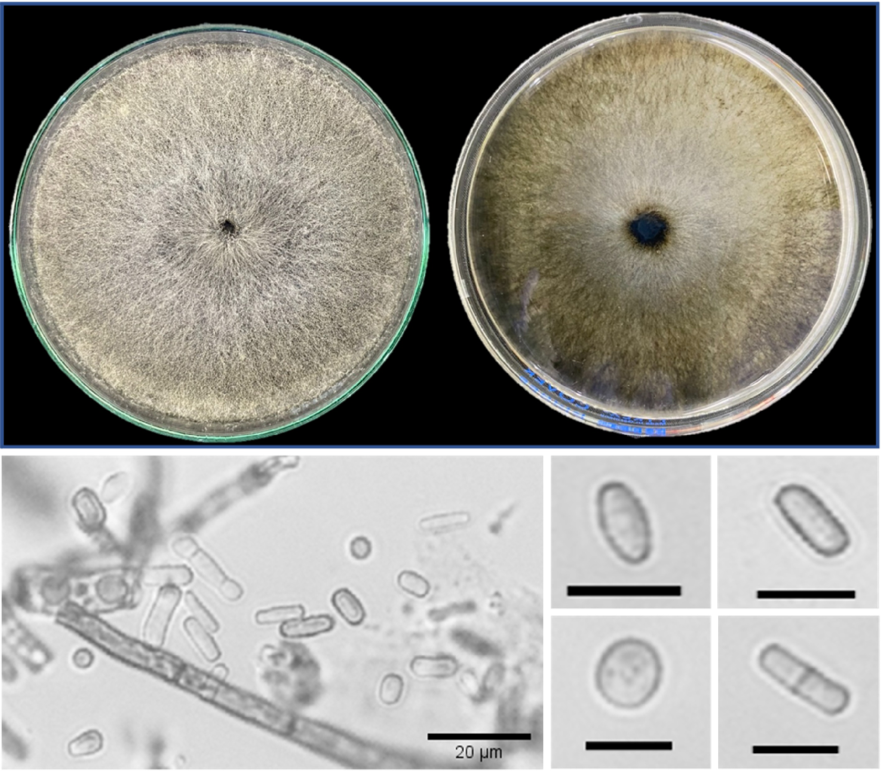 Cultural (left: front, and right: reverse side) characteristics (mycelia become darker after three days), and conidia morphology of 7-day-old Neoscytalidium dimidiatum. Scale bar = 10 µm.